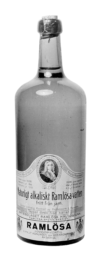 NATURLIGT ALKALISKT RAMLÖSA-VATTEN, tre helbuteljer Buteljer av ljusgrönt glas. Cylindriska, med tvärt indragen skuldra och kort, smal cylindrisk hals, kring vars mynning en vulstig utsvällning (s. k. stärkring); bottnen insänkt. Etikett vit, med konturerad överkant, på densamma i mörkblått text, nedtill vid vardera sidan svenska riksvapnet (firman leverantör åt dåvarande konungen och kronprinsen av Sverige), upptill i mitten varumärke (porträtt av Johan Jakob Döbelius, Ramlösa brunns grundläggare, 1707) i stående oval omramning. Korken överbunden med dubbla järntrådar. Höjd: 27 cm.; diameter: 8,7 cm. Inköpta av Wilhelmina von Hallwyl den 25 November 1929, från Ramlösa Hälsobrunn AB Stockholmsnederlaget.