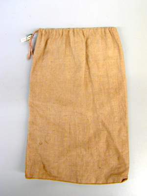 Sömmar nedtill och i ena sidan. Rosa knytband trätt genom övre fållen.