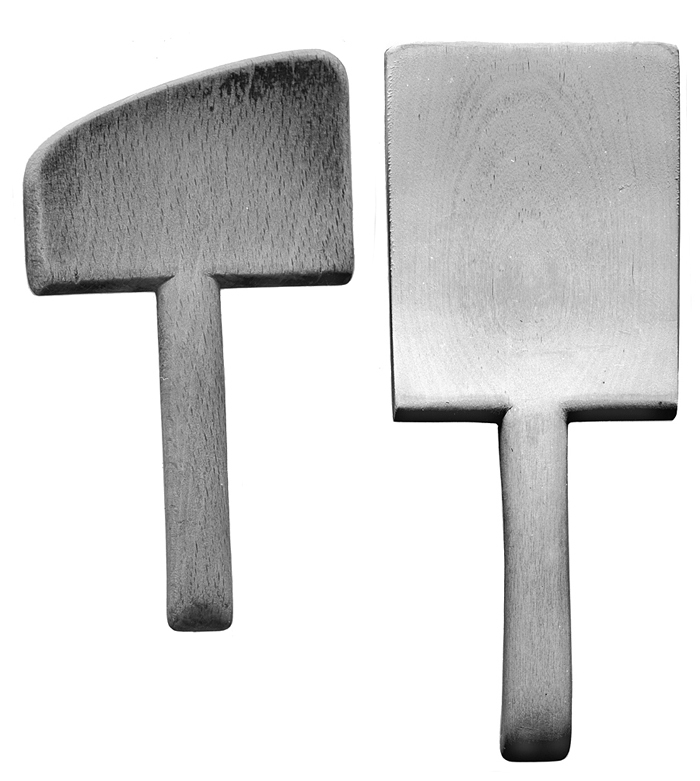PASSERSPADAR, två stycken Den ena av asp, den andra av rödbok. Blad rektangulärt, något böjt samt avrundat från undersidan mot ytteränden. Skaft nästan rundstavigt, utgående från bladet, på ytterändens undersida med en från skaftet utspard låg klack. Längd: 18,6 och 24 cm. Blad, bredd: 10,5 och 9,6 cm.