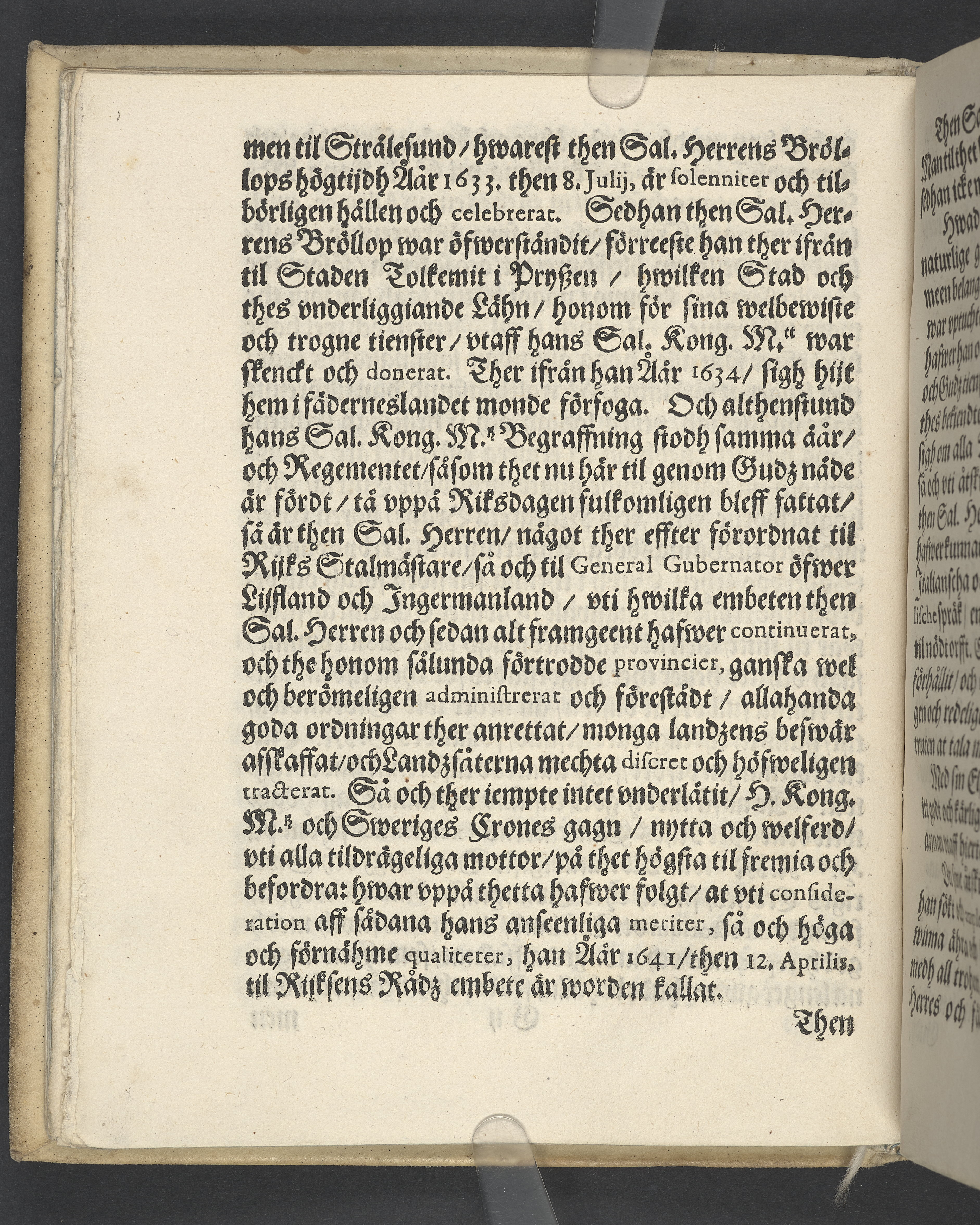 Innehåller även "Relation eller berättelse, om then ädle och högwelborne herres, Herr Bengt Oxenstiernas, frijherres til Ekebyholm och Söderboo, Sweriges rijkes rådz, rijks stallmästares, och general gubernators öfwer Lifland, ho̊ga förfarenheet, och widtkring om werlden giorda reesor".