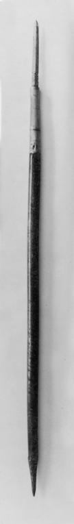 Klinga rak, slipad med jämnbreda skär, mjukt övergående i liten spets. 185 mm från spetsen ett dekorparti med fyra tvärgående linjer, bildande två 13-14 mm breda band med ett 7 mm brett mellanrum, eggen vid banden filad konkav, mellanrummet konvext, på det övre bandet en V-formig filning, på nedre bandet X-formig, ryggen på banden med en spetsoval skålning, på mellanrummet två triangulära hak mot bandlinjerna. Eggen nedanför dekorbanden oslipad. Klingan instucken i skaftet och fäst med träkilar. Kraftigt skaft av trä med spår spirallindning(?). Upptill en mässingsholk i två delar, den övre l: 152 mm med en tredubbel ring 76 mm från överänden och en enkel ring 4 m m från nederänden. Därnedanför en 84 mm lång något rörlig hylsa med dubbla ringar vid ändarna och på mitten. Nertill en konisk doppsko av stål, l: 145 mm, fäst med en två spikar, en med stor skalle och en med mindre.
