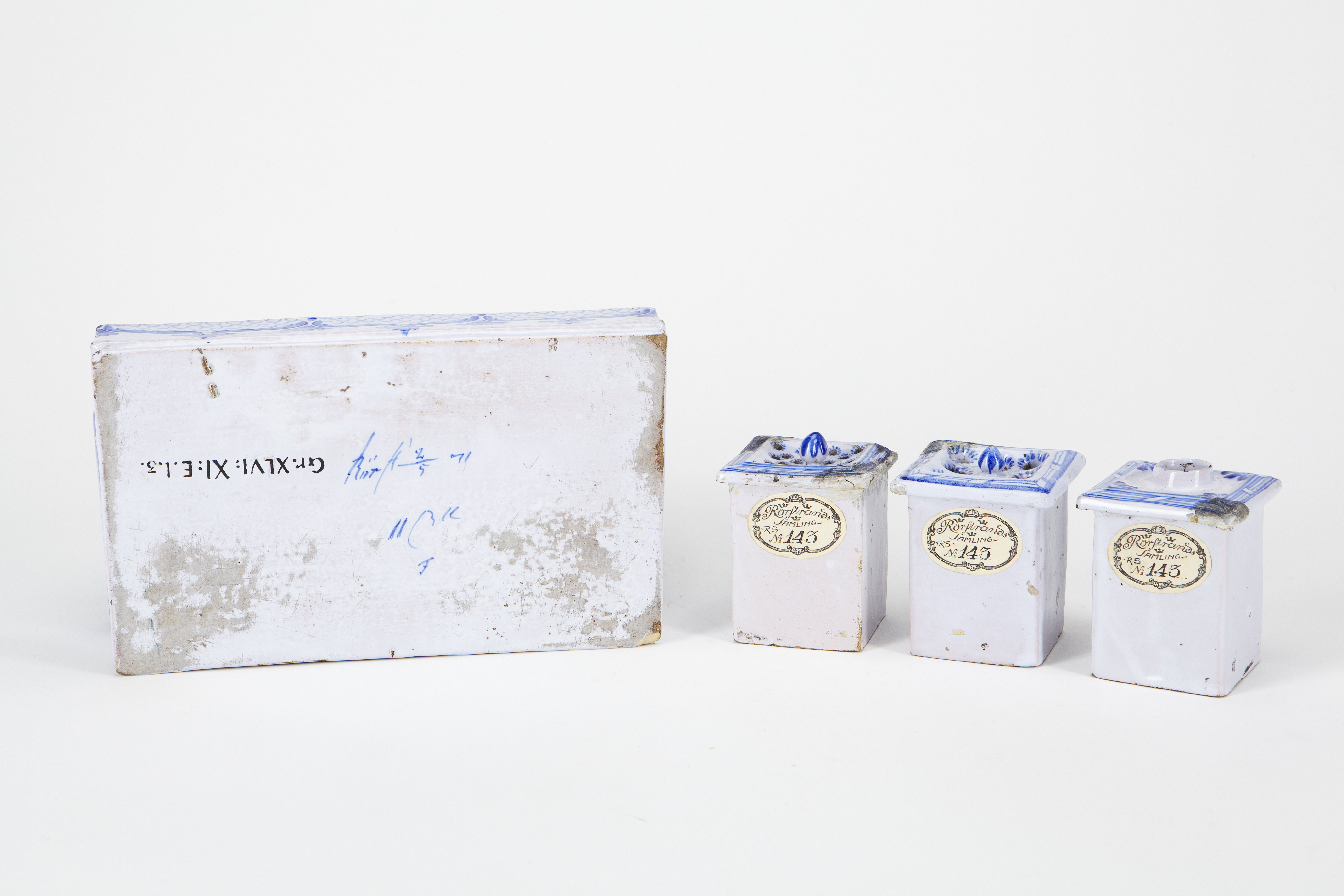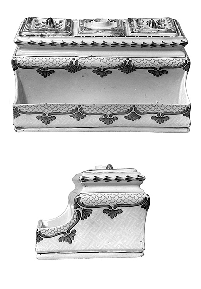SKRIVSTÄLL med bläckhorn, sandkar och pennställ. I form av en upptill öppen, långsträckt fyrsidig låda med något vulstig överdel samt profilerad stavformig kant, över öppningen två tvärgående skenor med rektangulärt tvärsnitt; längs framsidan ett fack för pennor o. d., dettas kortsidor upptill rundat insvängda samt nående till den vulstiga delen av stället. Runt bottenkanten en längdgående intagning. Bläckhorn, sandkar och pennställ nedsänkta i stället samt vilande mot en falskant utmed dettas öppning och skenorna; djupa, fyrsidiga, med insänkt botten och täckt översida (som lock) med utstående kant ; sandkar och pennställ med översidan svagt skålig samt genombruten av runda hål, på den förra mindre, på den senare större, vardera med lökformig knopp; bläckhornet med rund halskant i mitten. Dekor: I blått samt vitt (bianco sopra bianco) på ljust grågredelin tennglasyr. Godset brungult. Utmed ställets vulstformade överdel samt upptill på fackets utsidor i blått en fjällmönstrad botten. Utmed den stavformiga kanten upptill en bård i blått av palmettformigt ordnade liggande tredelade blad. Utmed de lösa delarnas lockkant en bård i blått; på bläckhornet innanför bården i varje hörn ett tredelat palmettornament, hålen på de övriga två locken omgivna av radiellt ställda korta streck, lockknopparnas övre del täckt av nedåtvända blad i blått. På utsidan av ställets botten en märkning i blått. På insidan av fackets botten påklistrad lapp med tryck i svart. Höjd 11,4 cm, längd 22,2 cm, bredd 13,6 cm. Lösa delar, höjd 8 cm, sidlängd vid kanten 6,1-6,3 cm.