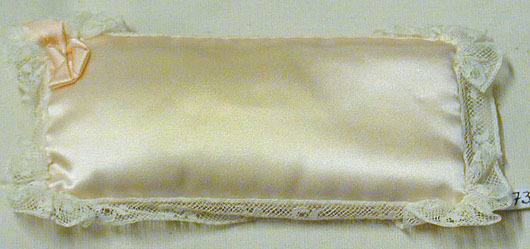 Doftkudde av svagt rosa duchesse. Rektangulär med längs kanterna påsydd spets. I ett hörnpåsydd rosett.