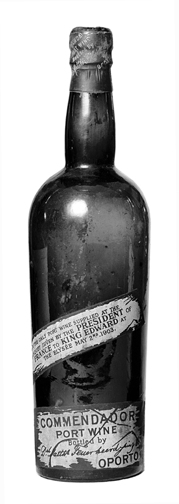 COMMENDADOR, D:ch Matth:s Feuerheerd Jun. & Co., Oporto, en helbutelj. Av gulgrönt glas. Cylindriska, med kupigt indragen skuldra och spolformig hals med en bred och en smal stärkring; bottnen konisk. Etiketter två, svarta, på dessa text i svart mot gul botten med imiterade trasiga kanter, på den övre: THE ONLY PORT WINE SUPPLIED AT THE BANQUET GIVEN BY THE PRESIDENT OF FRANCE TO KING EDWARD AT THE ELYSÉE MAY 2:ND, 1903. På den nedre firmanamn m. m. Kapsylfragment av förtent bly, svartfärgat, på detsamma text i relief. Höjd: 30,3 cm.; diameter: 8,3 cm.