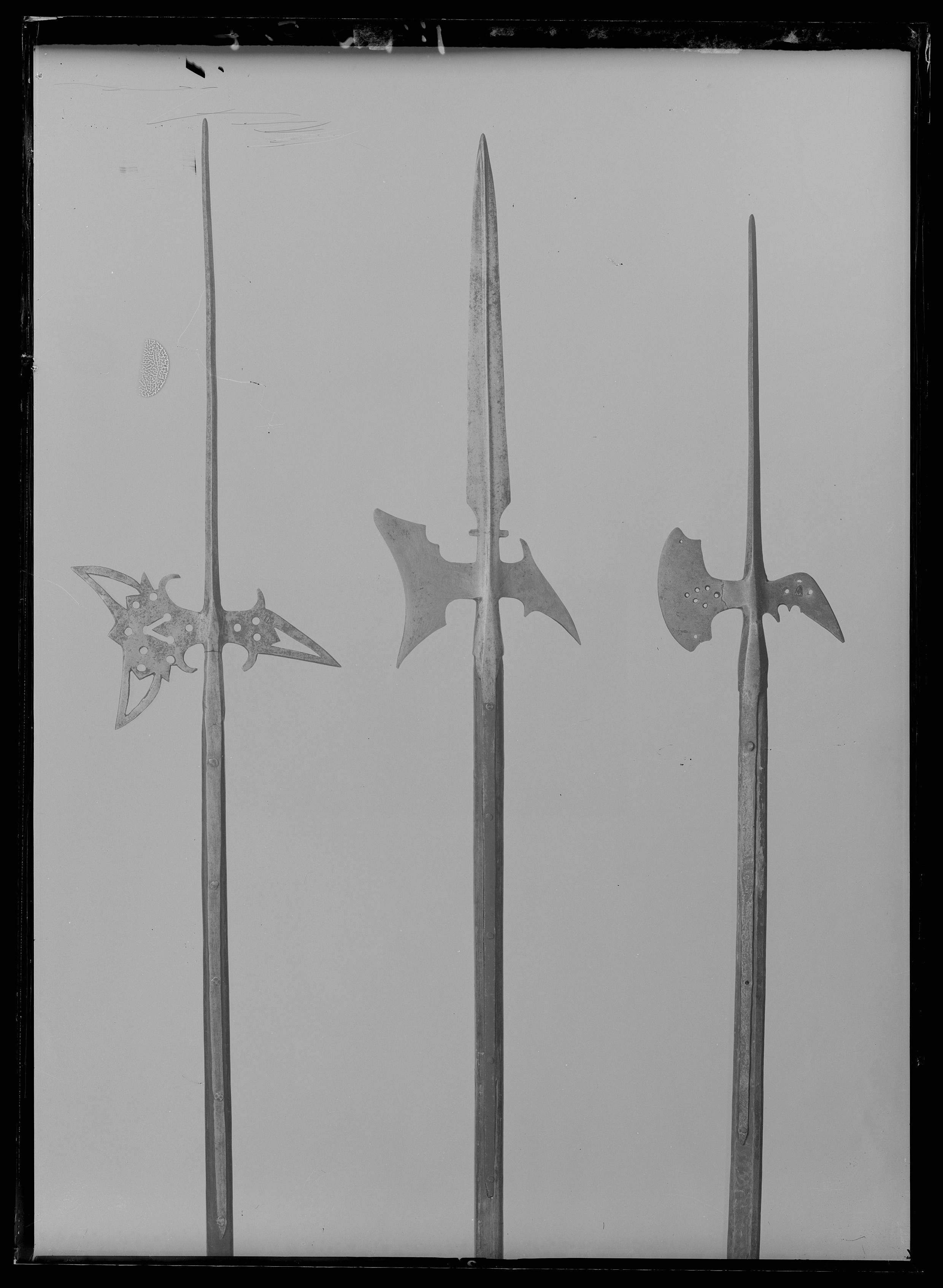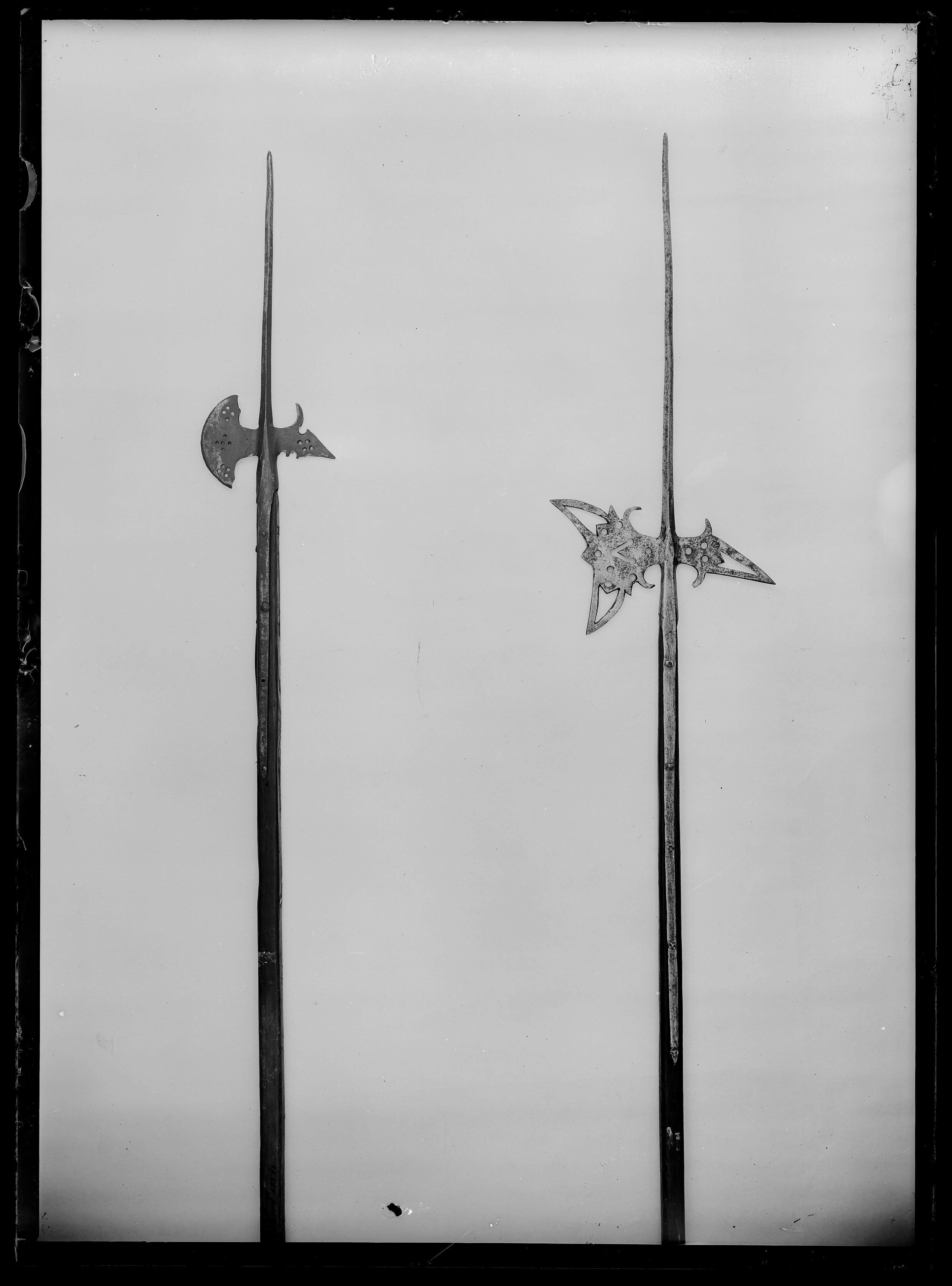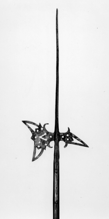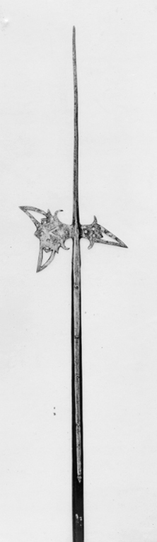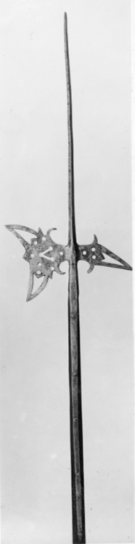 Långt utdragen klinga med rombiskt tvärsnitt. Yxbladet med konkav eggsida och vid spetsarna pilspetsliknande genombrutna ornament, därinnanför ett genombrutet V, omgivet av fem runda hål. Vid basens över- och undersida uppåt- och inåtsvängda flikar. Hake spetsig, svagt nedåtböjd med genombrutet ornament som på yxbladet, därinnanför tre runda hål samt på ovan- och undersidan två uppåt-inåtsvängda flikar. På hakens ena sida en sköldformig stämpel med ett andreas-kors. Holk, l: ca 77 mm, övergående i 677 mm långa skenor, fästade med fem nitar med plana huvuden. Skaft av brunbetsat trä med fyrsidigt tvärsnitt med avfasade hörn.