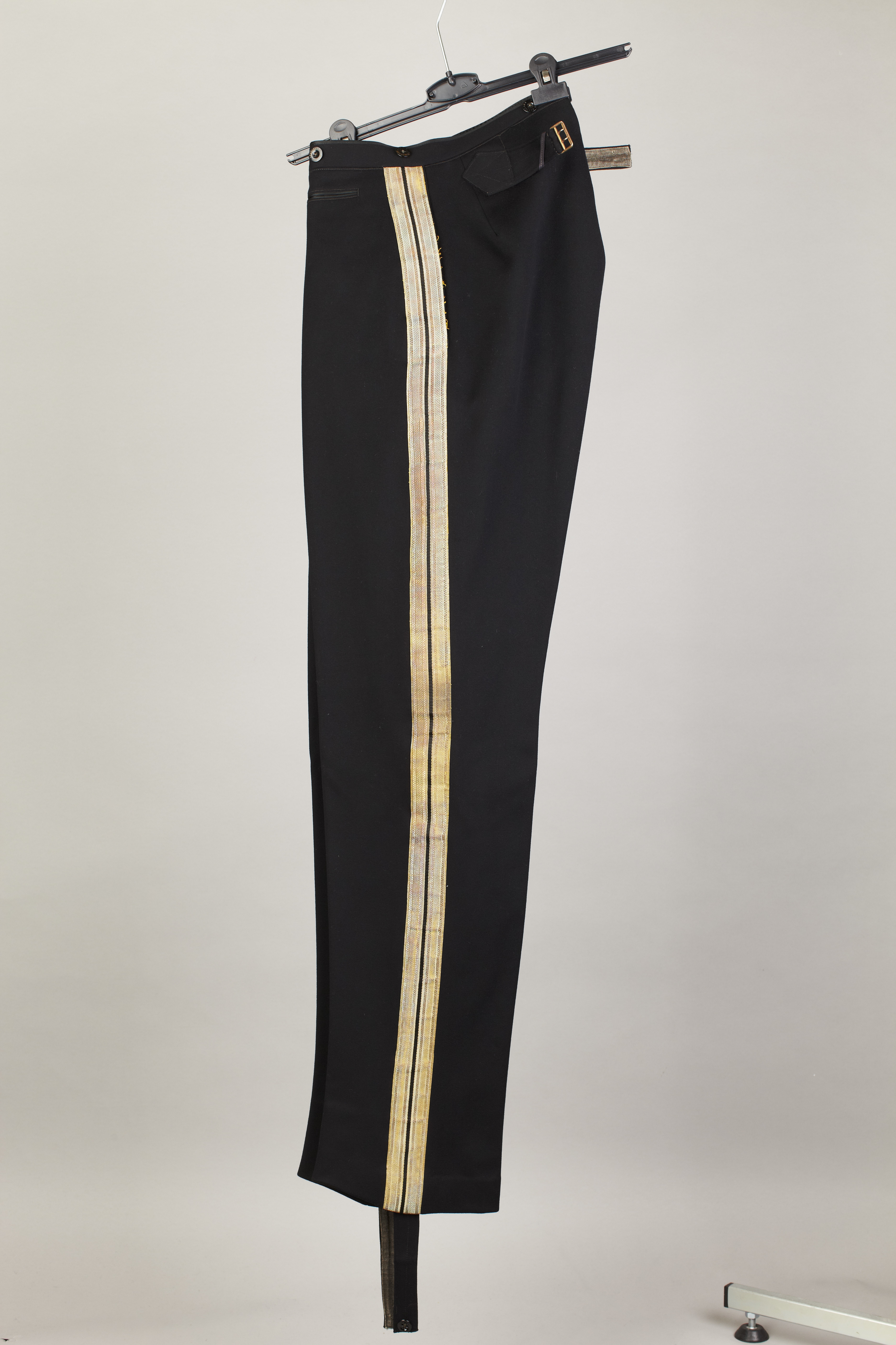 Långbyxor av svart kläde med revärer av 42 mm breda guldgaloner med svart rand i mitten. Gylf med dold knäppning med fem svarta plana plastknappar, d: 14 mm, märkta "FOR GENTLEMEN" samt med häkte upptill. Utefter linningen sex knappar, som föreg, d: 17 mm. Baktill spänntampar med mässingssölja av märket: "PARIS" och med hälla av svart bomull. Nedtill på byxorna hällor med en knapp i var ände, d: 16 mm som knäpps i knapphål fastsydda på byxbenens innersidor. Sidsömsfickor och en likn. stolpficka fram. Linningsfoder av svart bomullssatäng med spänntampar för gylfens knäppning.