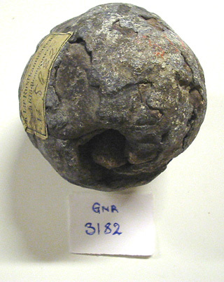 Kanonkula av sten med överdrag av bly. Den runda formen något ihoptryckt. Stenen blottad på flera ställen och på en sida finns en urgröpning som om en bit av stenen fallit bort. Funnen i Klara sjö. Inköpt 1862 av friherre Georg Abraham Fleetwood (1806-1870), nr 314 i hans samling.