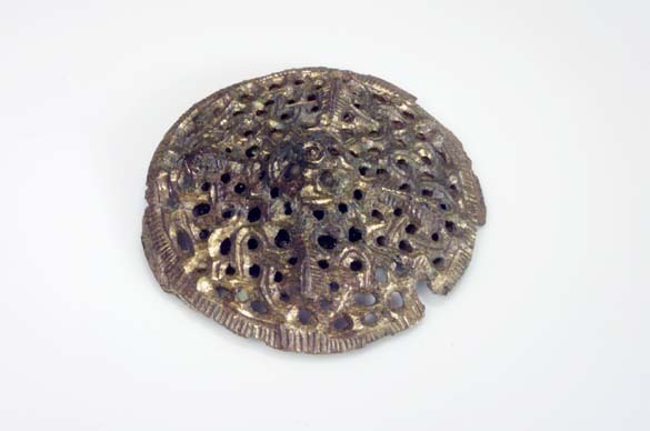 Stort, dubbelskaligt rundspänne av förgylld brons.