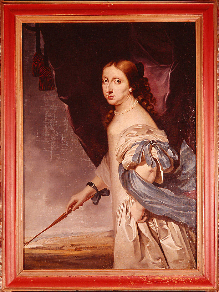 Replik av Abraham Wuchters, 1661. Målad av A Wuchters i Norrköping 1661. Jfr porträtt i Siena hos grevliga släkten Piccolomini-Adami. Skoklosterporträttet replik av detta porträtt. Knäbild, huvudet fas vänster, kroppen profil vänster. Vit klänning med blå rosetter. I handen spira. Kilad spännram. Rödmålad, profilerad ram med gulbruna lister, ramlistens bredd 100 mm. This portrait was painted by Wuchters during his stay with Queen Christina in Norrköping in 1661. The abdicated Queen had returned to Sweden to make sure that her privileged position and economic interests were not threatened after the death of Charles X in February 1660. The art loving queen found great joy in the presents of Wuchters and asked the Danish King Frederik III if he could spare his court painter until her return to Rome.