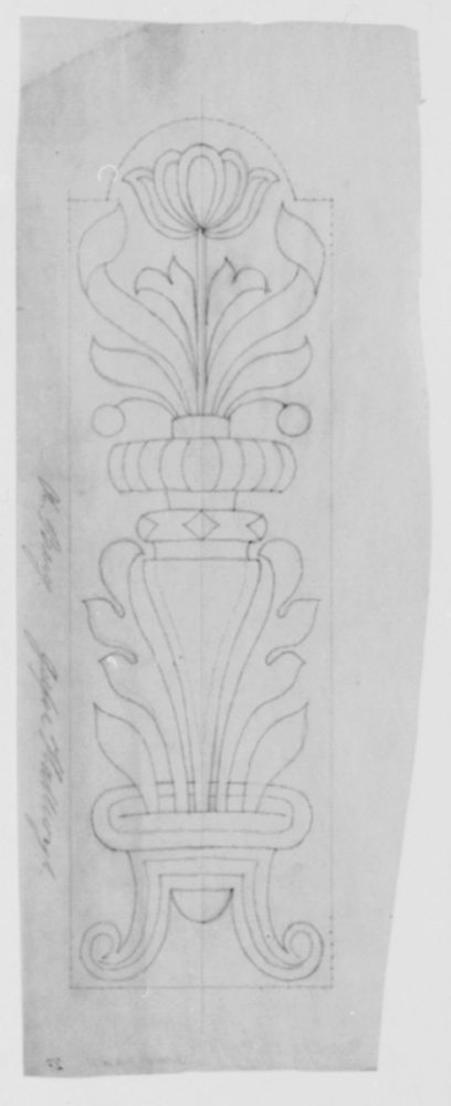 MÖNSTERFÖRLAGA, till möbelklädsel. Utgörande rygg till stol inv nr Gr VI:II:A.a.11 (för beskrvning se Hallwylska samlingen, Gr VI, tex s. 330 f.f.) Urna med blommor. Påskrift "Grefve Hallwyl. K. Berg" Papperet punkterat för mönsteröverföring Mått: 56,2cm B 22 cm Gåva 1943 av arkitekt Gustaf Clason (se protokoll 54 º 4)