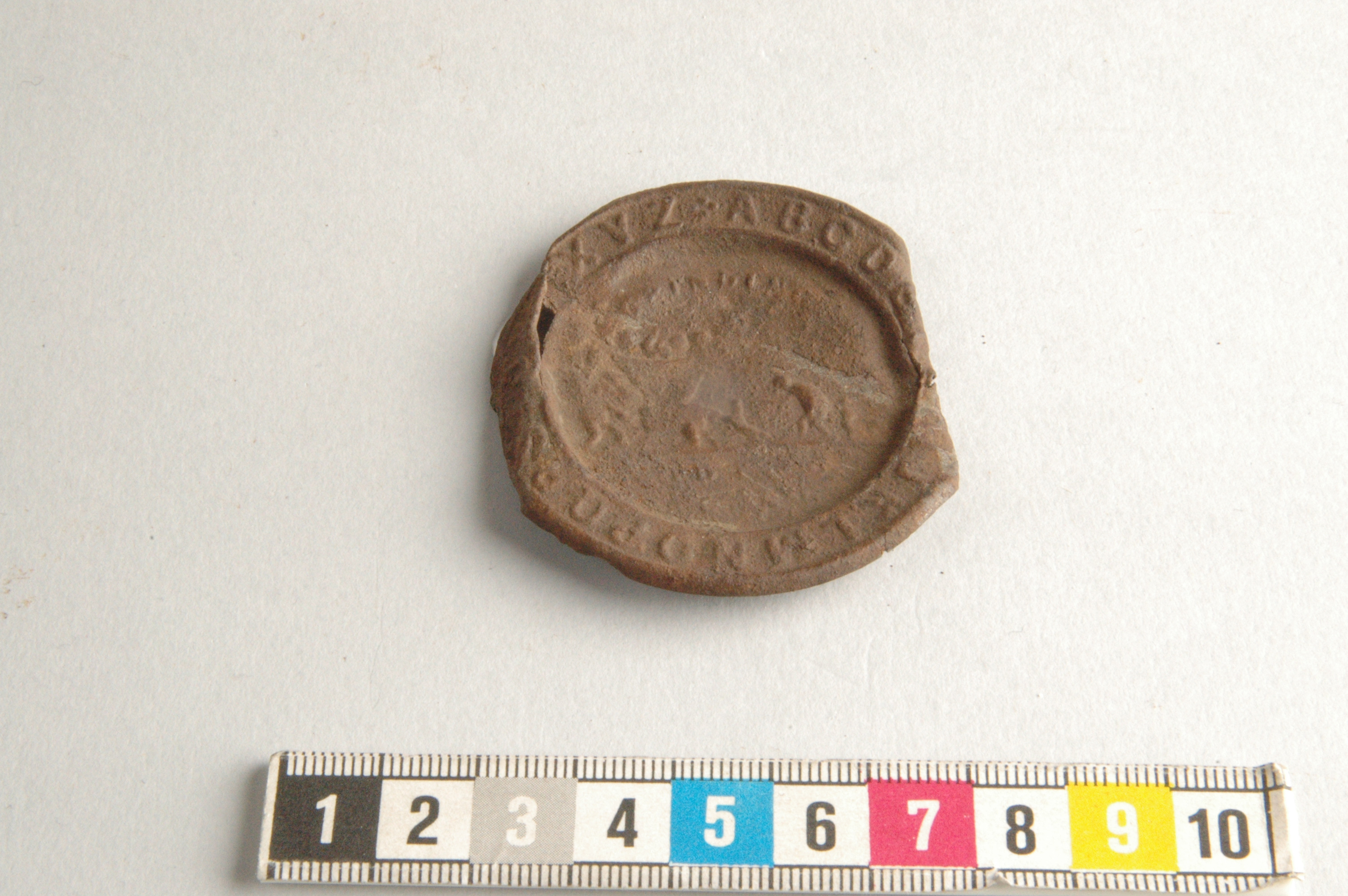 Runt, tunt bleck, som liknar ett lock. Kan ha suttit på en dosa.
