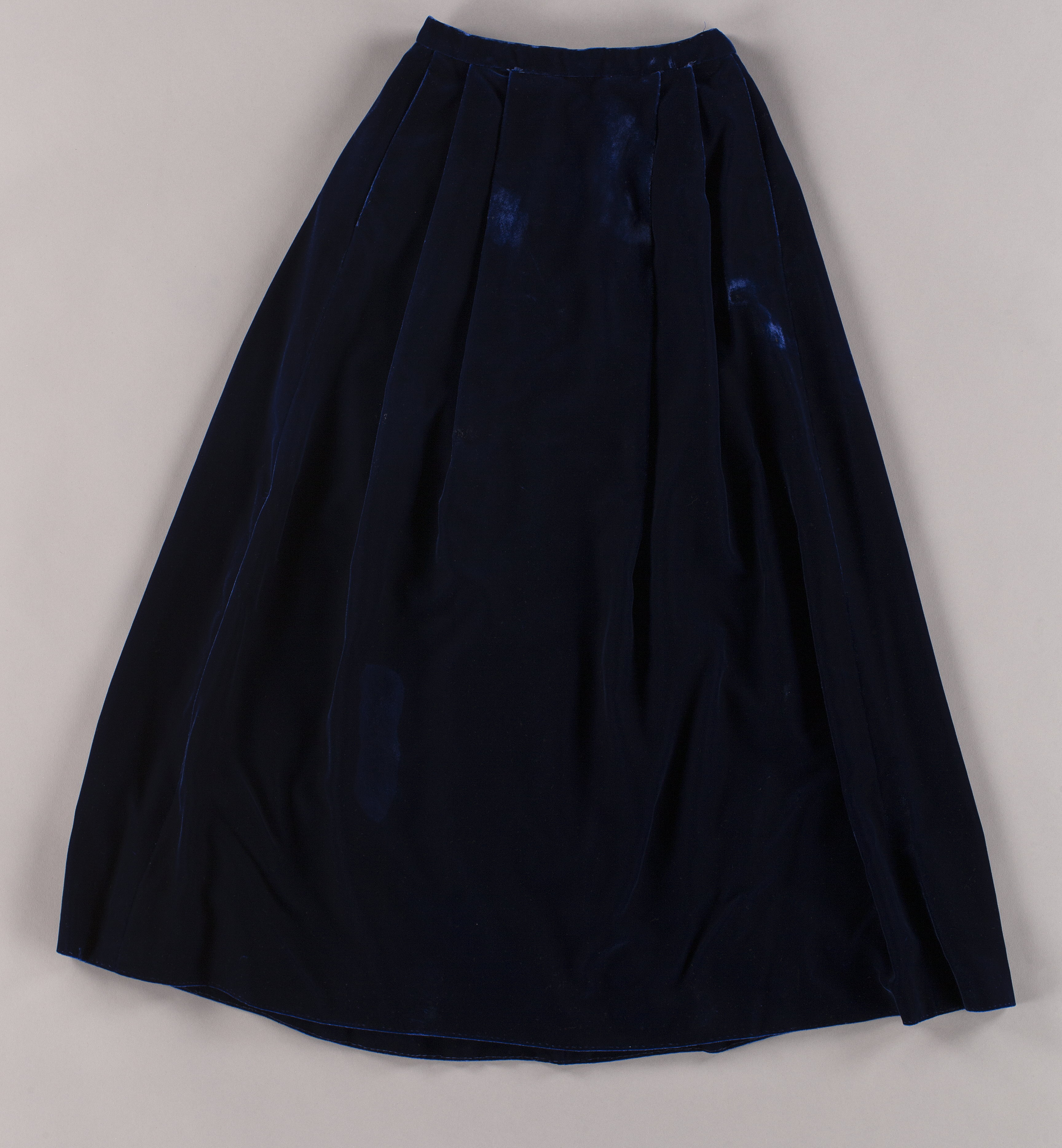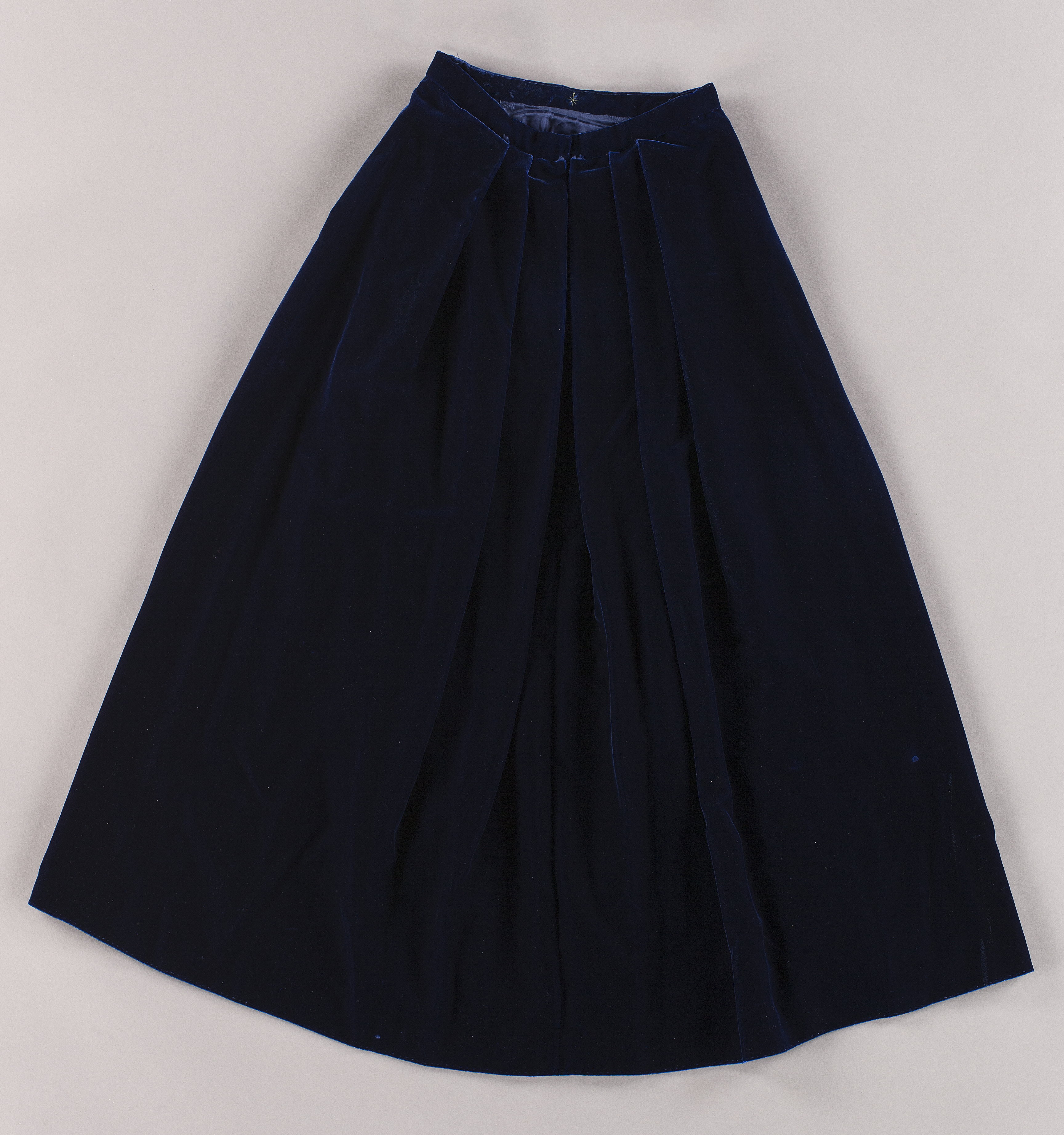 Hellång kjol av mörkblå sammet med mycket vidd, sydd i tre våder, med söm mitt bak och med blixtlås mitt bak i sömmen. 30 mm bred linning. Knäppning mitt bak med dubbla hakar och tränsar. I midjan lagda veck, sex stycken bak, lagda mot mittsömmen, som döljer mittsömmen. Fyra veck framtill, två på vardera sidan, så att kjolen är slät mitt fram. I framstyckets sidosömmar två fickor. Foder av blå polyester. På linningens insida märkning i form av en broderad "stjärna".