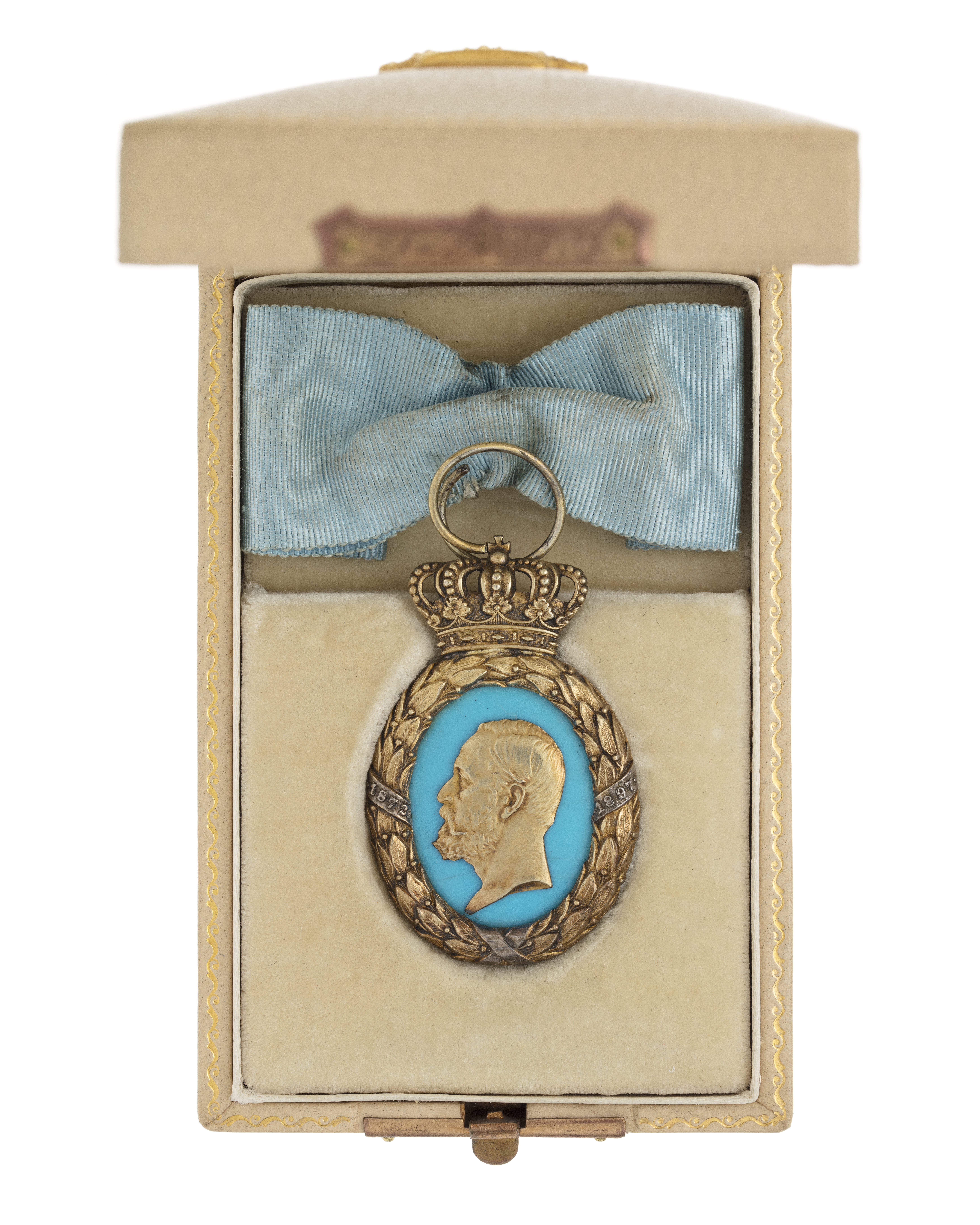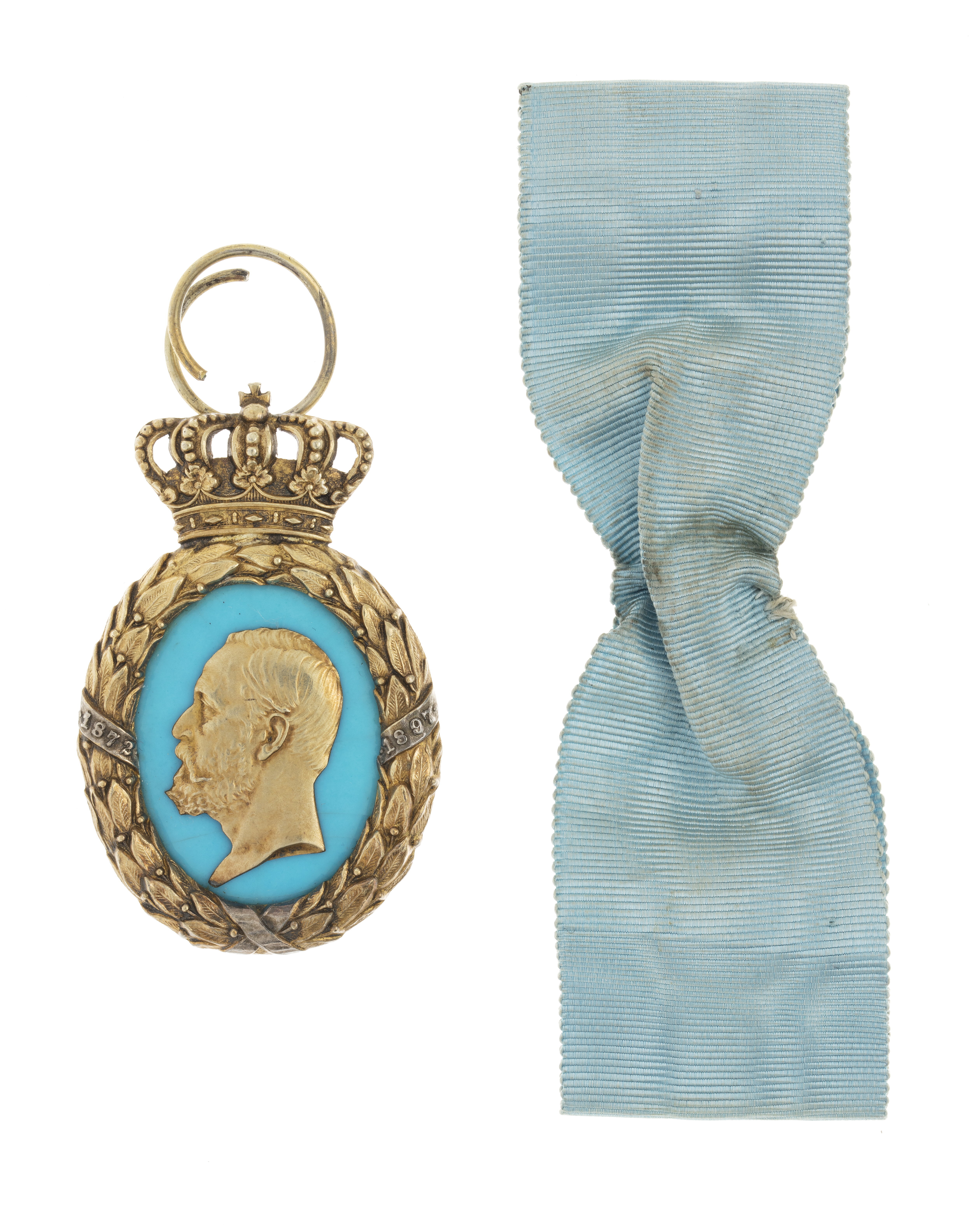 Konung Oskar II:s svenska jubileumsminnestecken 1897. Har tillhört drottning Victoria. Gåva av konung Gustav V:s arvingar gm drottning Louises statsfru.