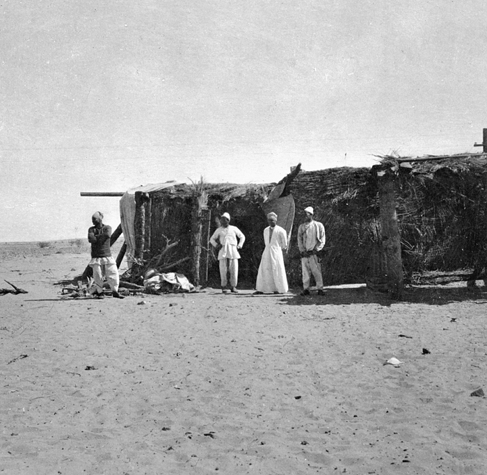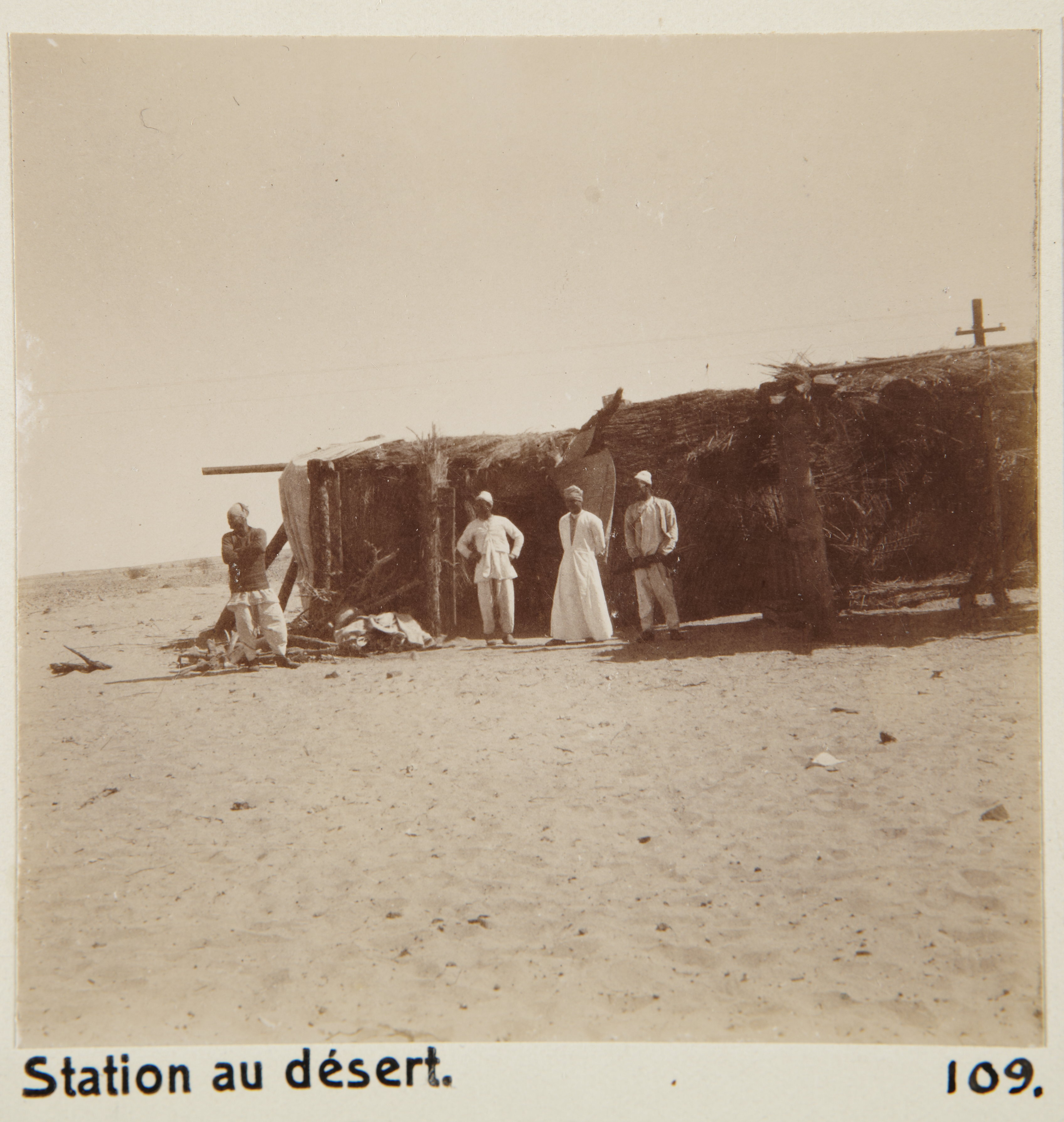 Tågstation i öknen. Sudan. Text på fotografiet: Station au désert Fotografierna LXVI:M.01.- 201. kommer från resan till Egypten och Sudan som Wilhelmina och Walther von Hallwyl gjorde vintern 1900-1901. De lämnade Sverige den 5 november 1900 och fortsatte från Egypten till Palestina den 28 mars 1901. Med på resan var döttrarna Ellen med maken Henric de Maré och Irma med maken Wilhelm von Geijer. Wilhelminas sällskapsdam, fröken Ida Uhse reste också med. Under en del av resan anslöt sig ledamoten av Internationella domstolen i Kairo, assessorn Otto Conrad Waldemar Cedercrantz med makan Anna Elisabeth. Vid resan uppför Nilen hade Walther von Hallwyl hyrt ångfartyget Columbia med besättning. Båtresan startade i Kairo 27 december 1900, gick ända till Wadi Halfa varifrån man reste vidare med tåg till Khartum och tillbaka till Wadi Halfa. Båten vände åter i riktning mot Kairo, men det verkar som att sällskapet tog tåg sista biten, från Luxor. Henric och Ellen de Maré samt fru Cedercrantz lämnade båten redan då de passerade Luxor första gången. Resten av sällskapet återvände till Kairo den 1 mars. Fotografierna LXVI:M.01.-120. togs av resenärerna själva, de största av Ellen de Maré, de mellersta av Wilhelmina von Hallwyl och de minsta av Wilhelm von Geijer. Resten köptes av professionella fotografer i Kairo, de flesta från Studio Photogr. Artistique G. Lekegian & Cie. Alla uppgifter kommer från Ida Uhses reseanteckningar.