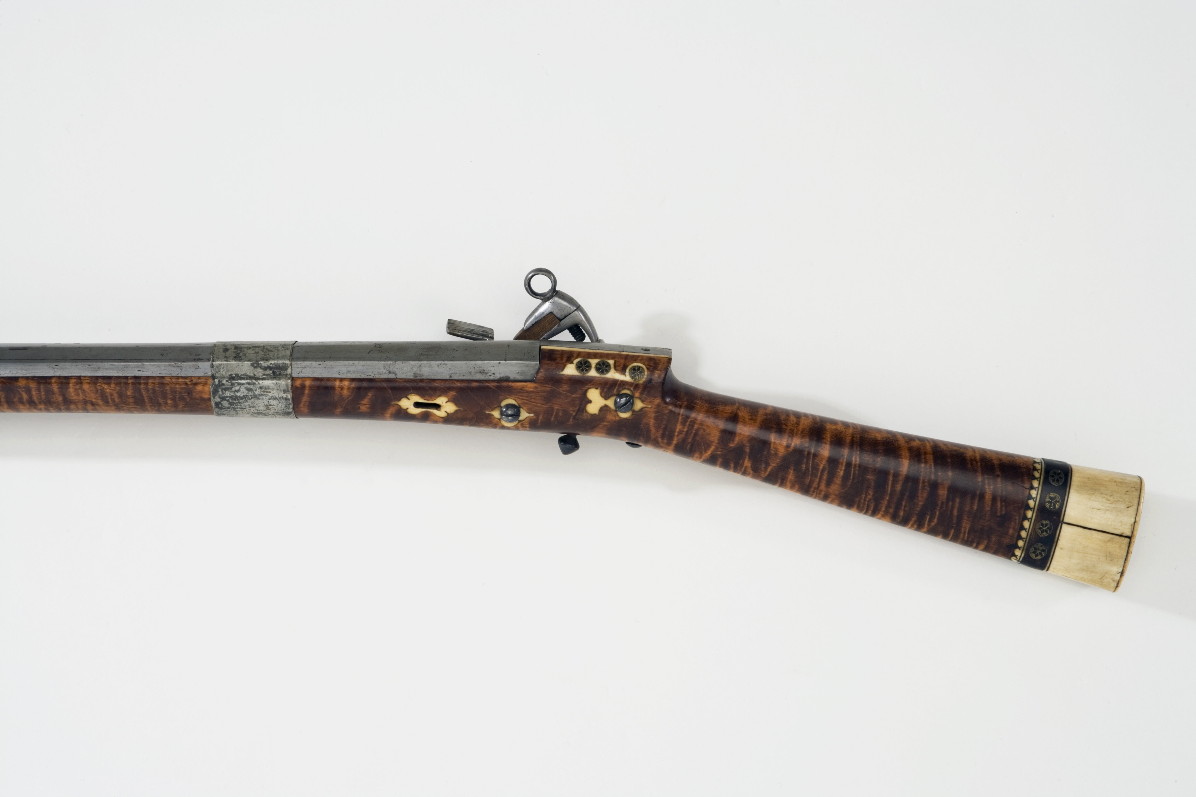 Rund, slätborrad pipa av stål med åttsidig kammare. Pipan plan på ovansidan i hela sin längd. Kammarens ovansida baktill rundslipad. Rester av nött etsad dekor, i form av blomsterornament på kammarens ovansida. På kammarens ovansida etsat "A MORETTA" (Stockel sid 214). Två breda pipband av försilvrad mässing. Snapplås av katalantyp av stål. Låsbleck långt och konturerat, plant. Svagt böjd hane med lös överkäke. Ringformig käkskruv. På hanfotens tå hake. Batteri med plant eldstål med räfflad framsida. Utvändig slagfjäder. Fästning: Två låsskruvar av stål. Rak, kort avtryckare av stål med kulformig ände. Helstock av flammigt trä som slutar 114 mm från pipans mynning. Den främre delen av mörkt horn, l: 113 mm. Rak smal kolv med rundad tresidigt tvärsnitt. Bakplåt och bakre delen av kolven av vitt ben, framför den band av mörkt horn med runda inläggningar av förgylld mässing med rosettmönster i niello (?) och uddkant av vitt ben. På vardera sidan om svansskruvbladet ornament av ben med inlagda cirklar av förgylld mässing med rosett i niello (?). Framför låset och på framstocken genomgående rektangulärt hål för gehäng med konturerad skoning av ben. Avtryckarbleck av ben, konturerade. Låsskruvbrickor av konturerat ben. Tillbehör: Laddstock av trä 914 mm lång med 81 mm lång doppsko av stål med knappformig avslutning. Träbit i stället för flinta.