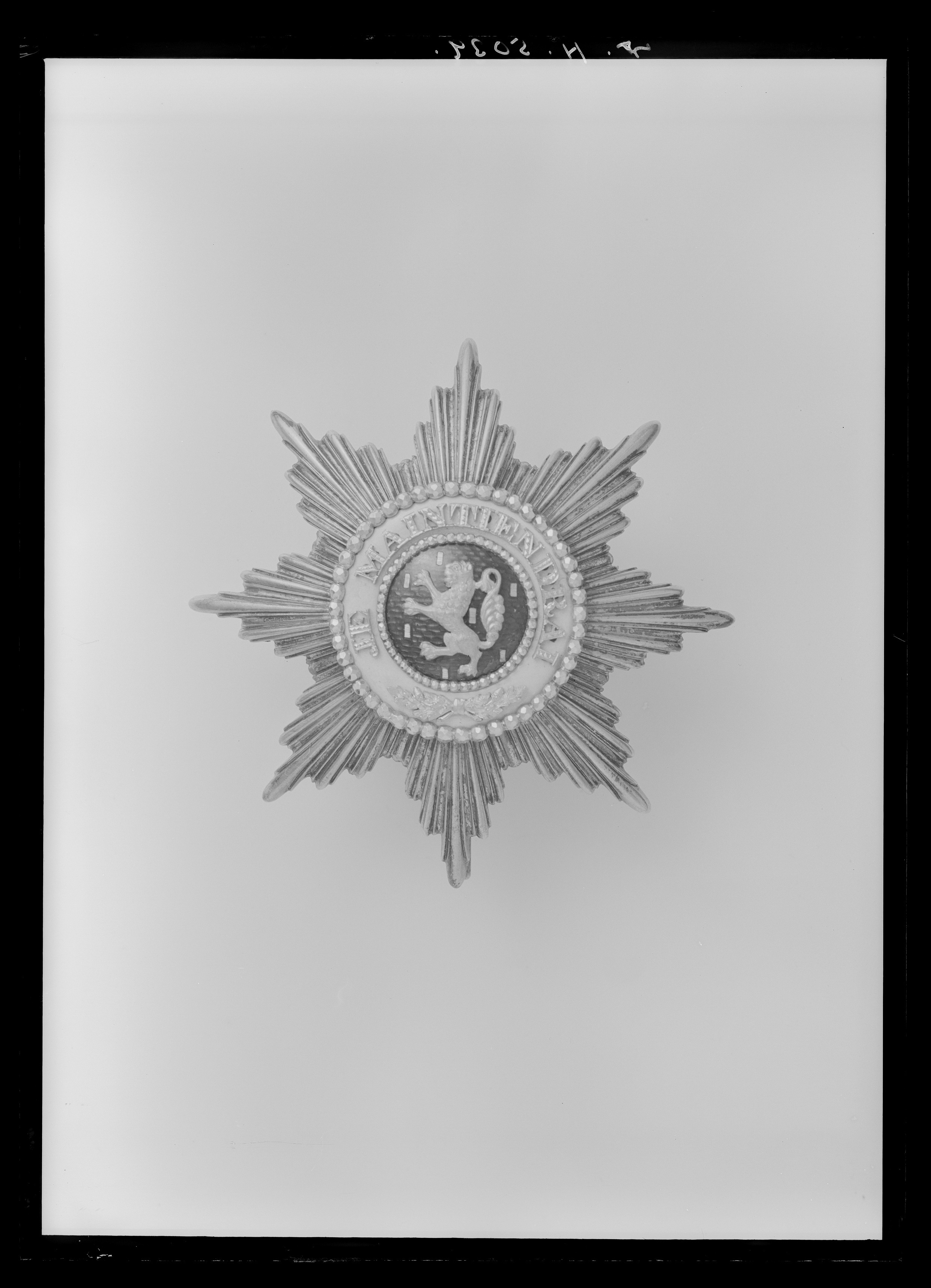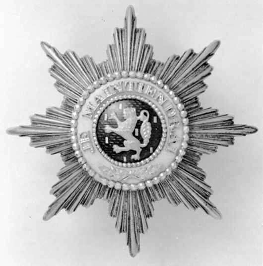 Åttauddig strålstjärna av silver, varannan stråle konvex, varannan konkav. Välvd medaljong täckt med mörkblå emalj, därpå fäst guldlejon samt sju strödda guldbiljetter. Däromkring vitemaljerad ring kantad med ringar av fasetterade guldpärlor, den yttre grövre än den inre. På emaljringen fäst guldtext:"JE MAINTIENDRAI" samt nertill ekkvistar av guld. Baksidan slät, på medaljongen firmastämpel: "C.M. WEISHAUPT // SÖHNE". Vertikalt placerad säkerhetsnål av silver.