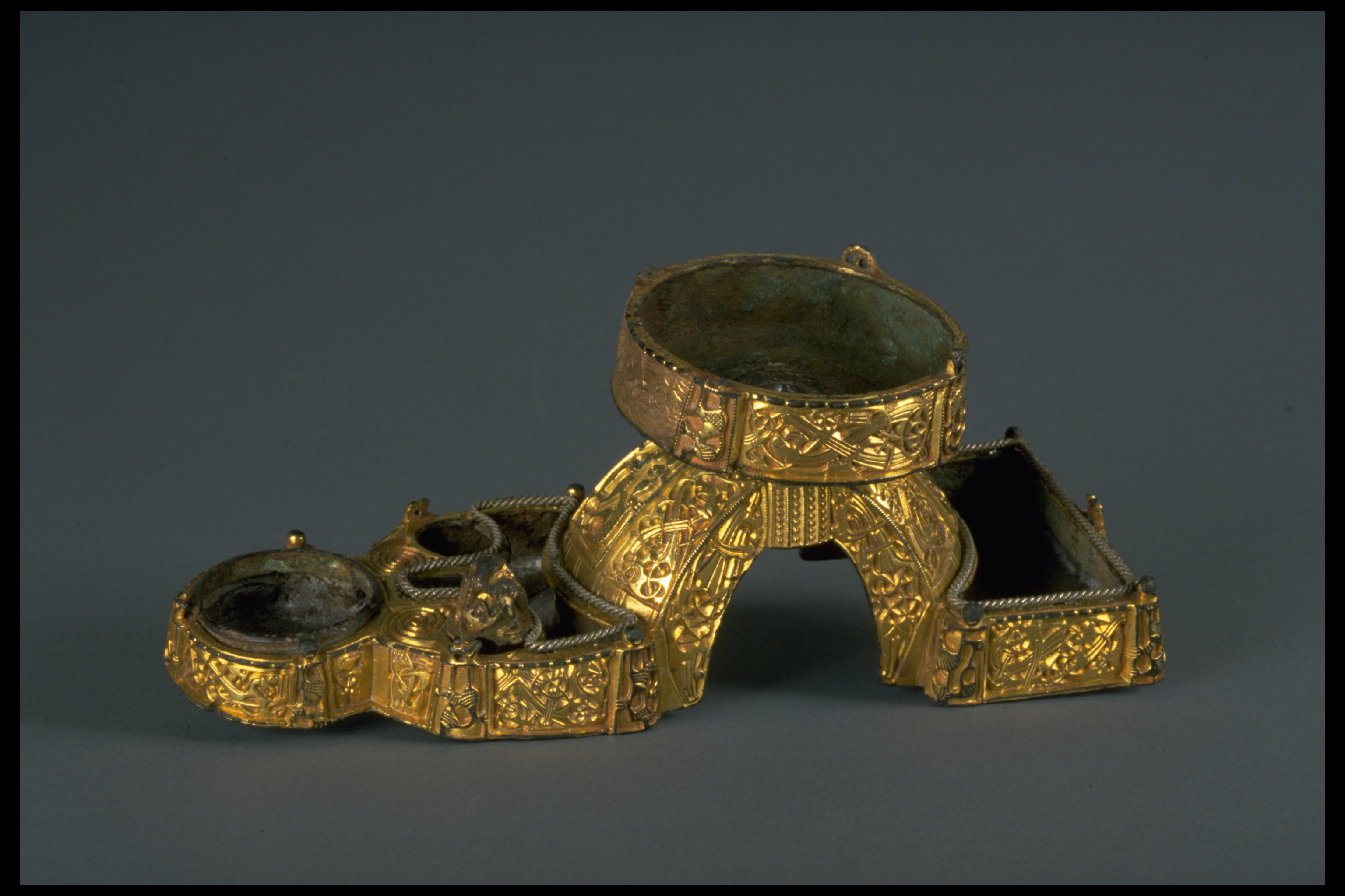 Ryggknappspänne, tidig stil III + gripdjur (funnen utan knapp som hittades vid senare tillfälle: jfr. SHM 1361). Saknar inläggsskivorna. Dekor även på undersidan av runda fält och ränder. de borttagna skivorna är inkransade med snodd silvertråd