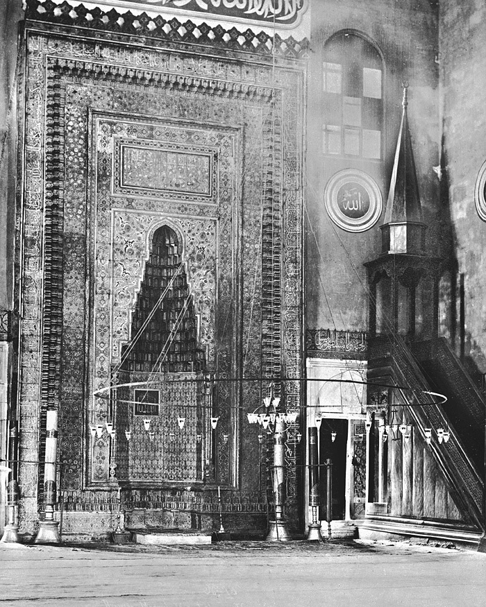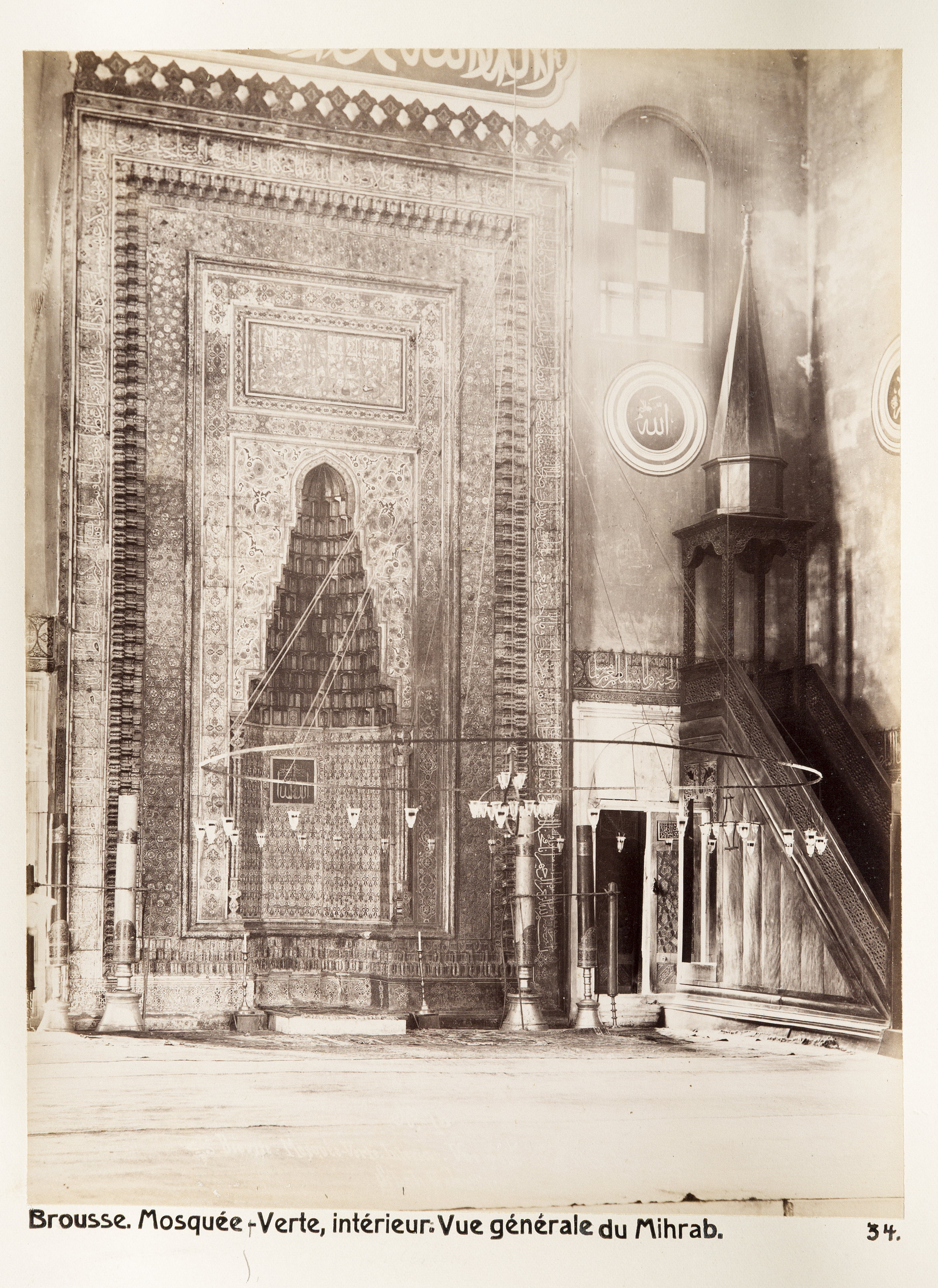 Bursa. Gröna moskén, interiör. Vy mot mihraben. Text på originalet: "Brousse. Mosquée Verte, intérieur. Vue générale du Mihrab" Fotografierna LXVI:O.01.-54. kommer från resan till Turkiet och Mindre Asien som Wilhelmina och Walther von Hallwyl gjorde den 27 april - 20 juni 1901. De lämnade Sverige den 5 november 1900 för Egypten, där de stannade till den 28 mars 1901, då de fortsatte till Palestina. Den 27 april fortsatte de till Turkiet och Mindre Asien. Med på resan var Wilhelminas sällskapsdam, fröken Ida Uhse. I Konstantinopel (Istanbul) anslöt sig Wilhelminas mor Johanna Kempe och kusindottern Elma Hök. Fotografierna är inköpta av Wilhelmina i Konstantinopel (Istanbul) och Brussa. Alla uppgifter kommer från Ida Uhses reseanteckningar.