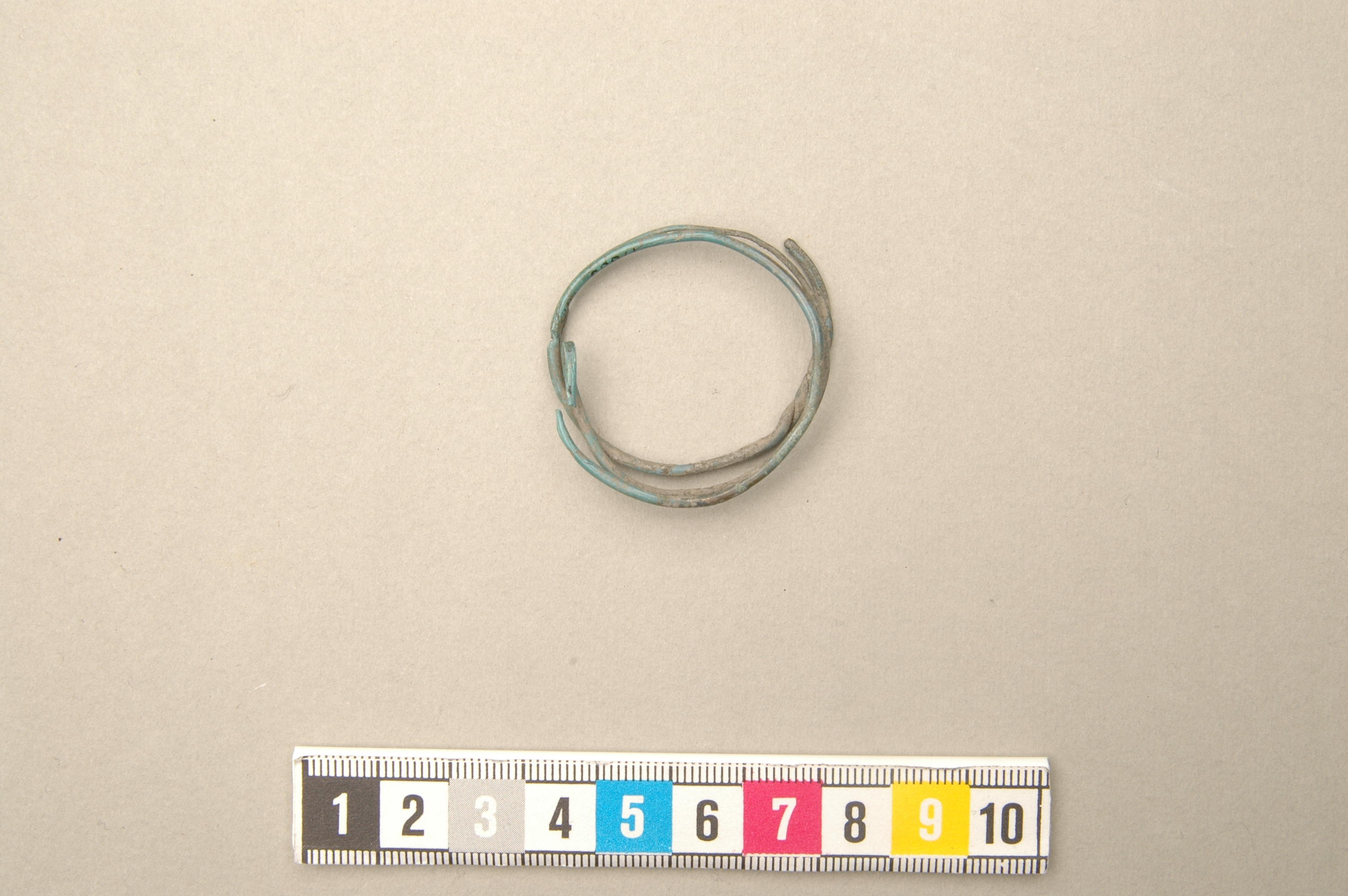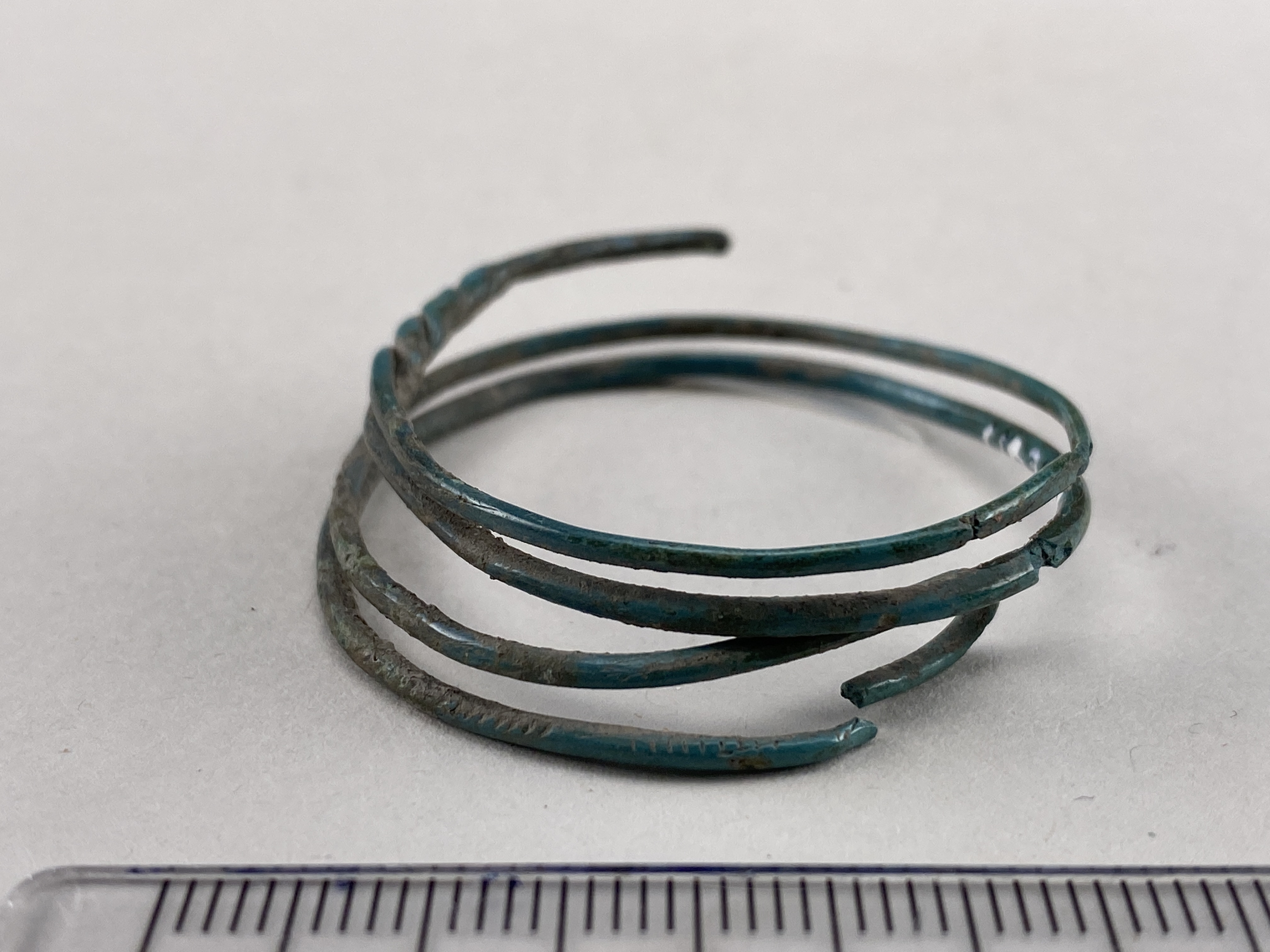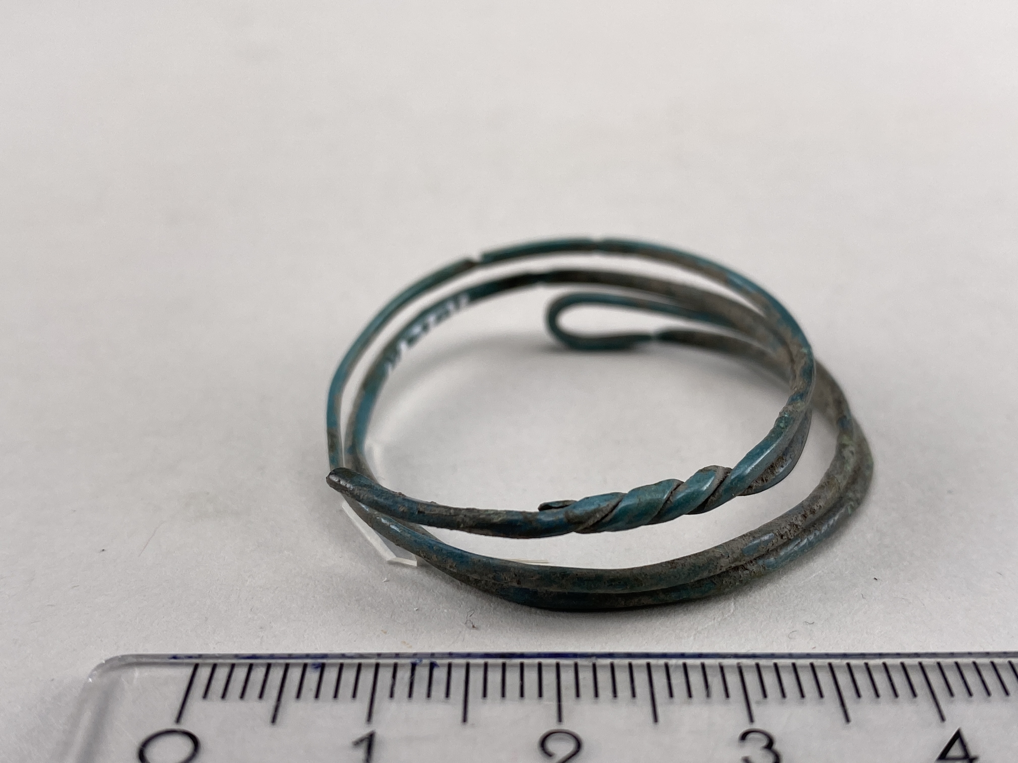 Ring, möjligen en hårring, av smal, dubbel spirallagd bronstråd. Hopvriden i ena änden.
