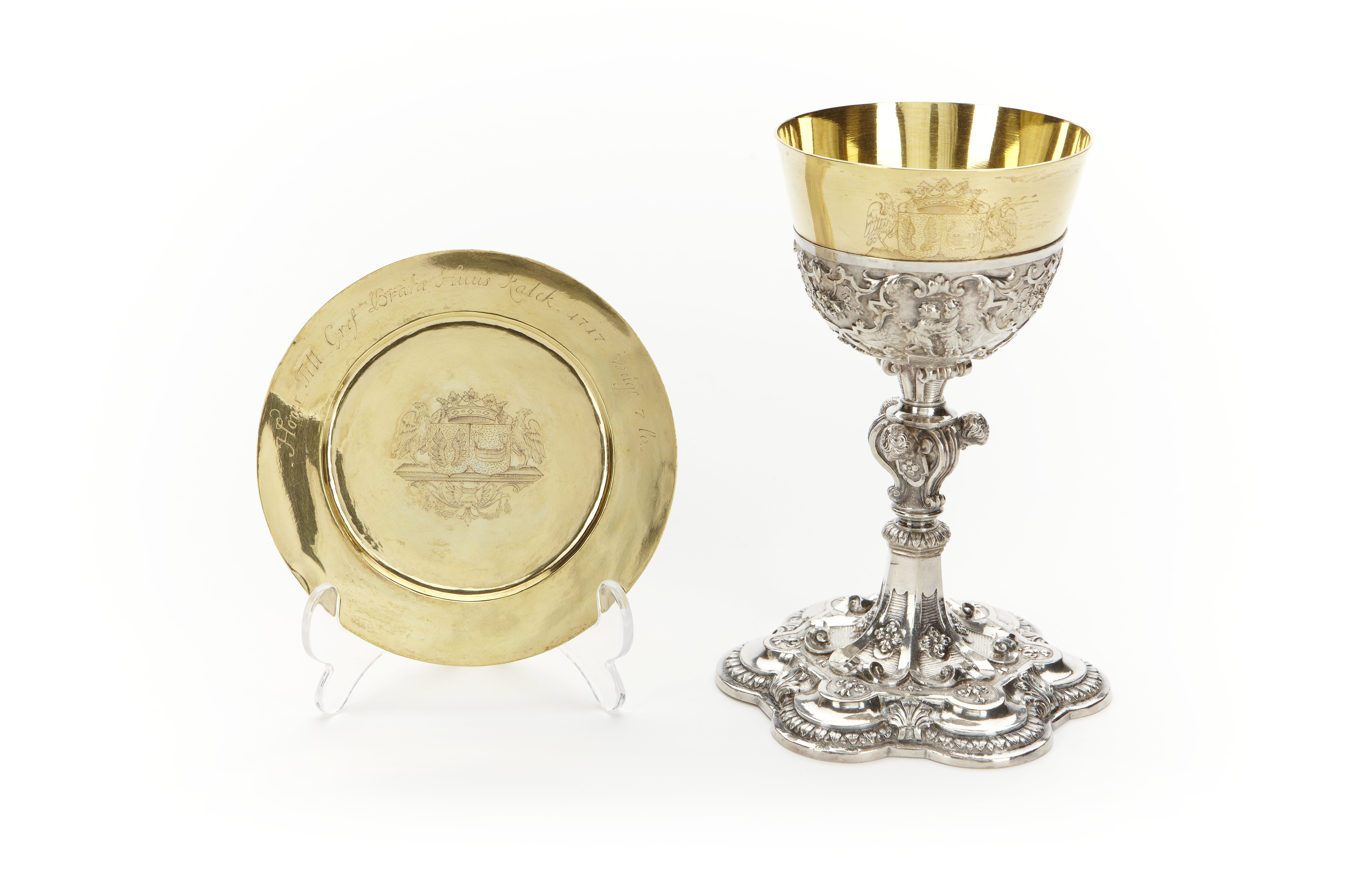 Gustaf Stafhell d.ä. Stockholm 1717 resp 1718 (kalk och paten) samt okänd skandinavisk smed omkring år 1700 (oblatask). Dekor av putti representerande Tro, Hopp och Kärlek. Balusterformat ben och sexpassformig fot, likaledes oförgyllda. På kupan braheska och bondeska alliansvapnet och inskriften: " Grefve Brahes Huus Kalk A:o 1771 W:r 33 och en halv lo". Förgylld paten med braheska och bondeska alliansvapnet och inskriften: "Hörer Till Gref Brahes Huus Kalk. 1717." Wäg:r 7 lo. Stämplar: St Erik i profil (SB 516) (ej i SS) GS (SB 524) på kalken årbokstav E, respektive på paten F.