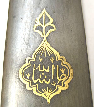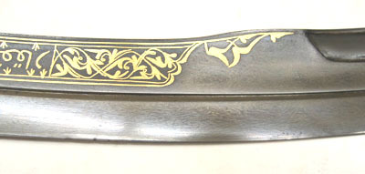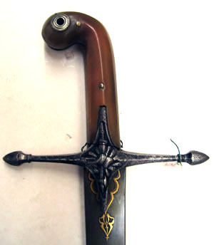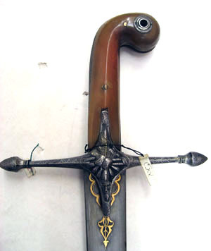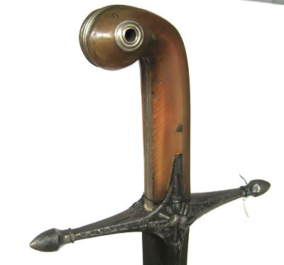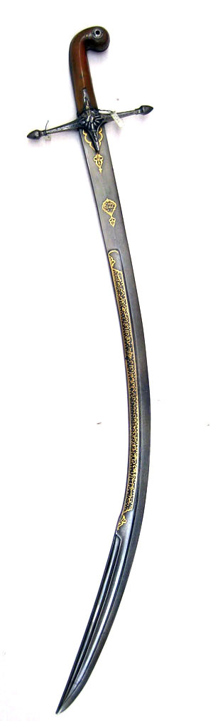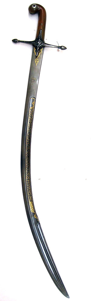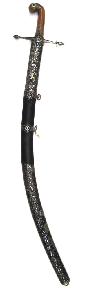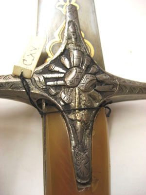 Fäste av graverat silver i form av trofégrupp på krysset. Raka parerstänger med ollonformiga ändar, punsade. Parerstängerna har sexkantig genomskärning. Graverade styrskenor. Kaveln består av en profilerad stålskena med två plattor av ljust horn. Kavelns ytterände är böjd mot eggen och har en silverskodd bössning. Klinga eneggad av stål (wootz) med jelman. Damaskerad med inläggningar och inskriptioner av guld vid klingbasen. Längs klingans rygg och på klingsidan intill ryggen. Jelmanen har två räfflor.