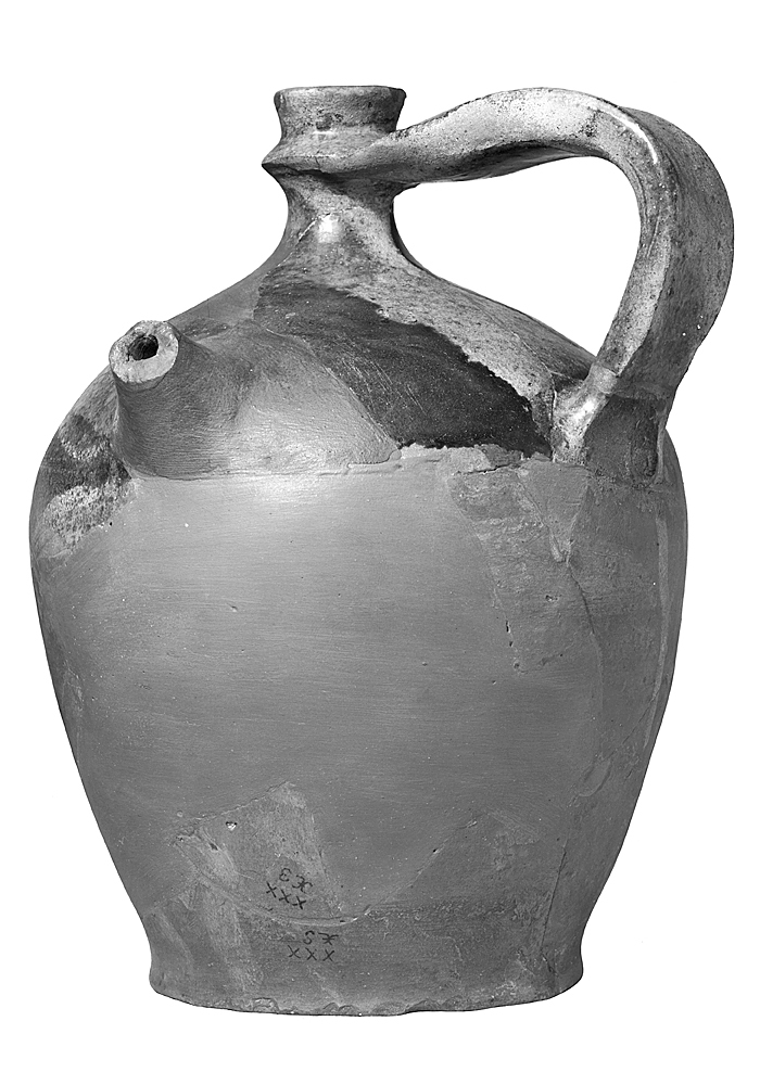 KÄRL, krus Av rödbrunt lergods, överdelens utsida med grön blyglasyr. Hopsatt av ett flertal fragment Omvänt päronformigt. Hals smal med något vidgad mynning. På bukens överdel en pip