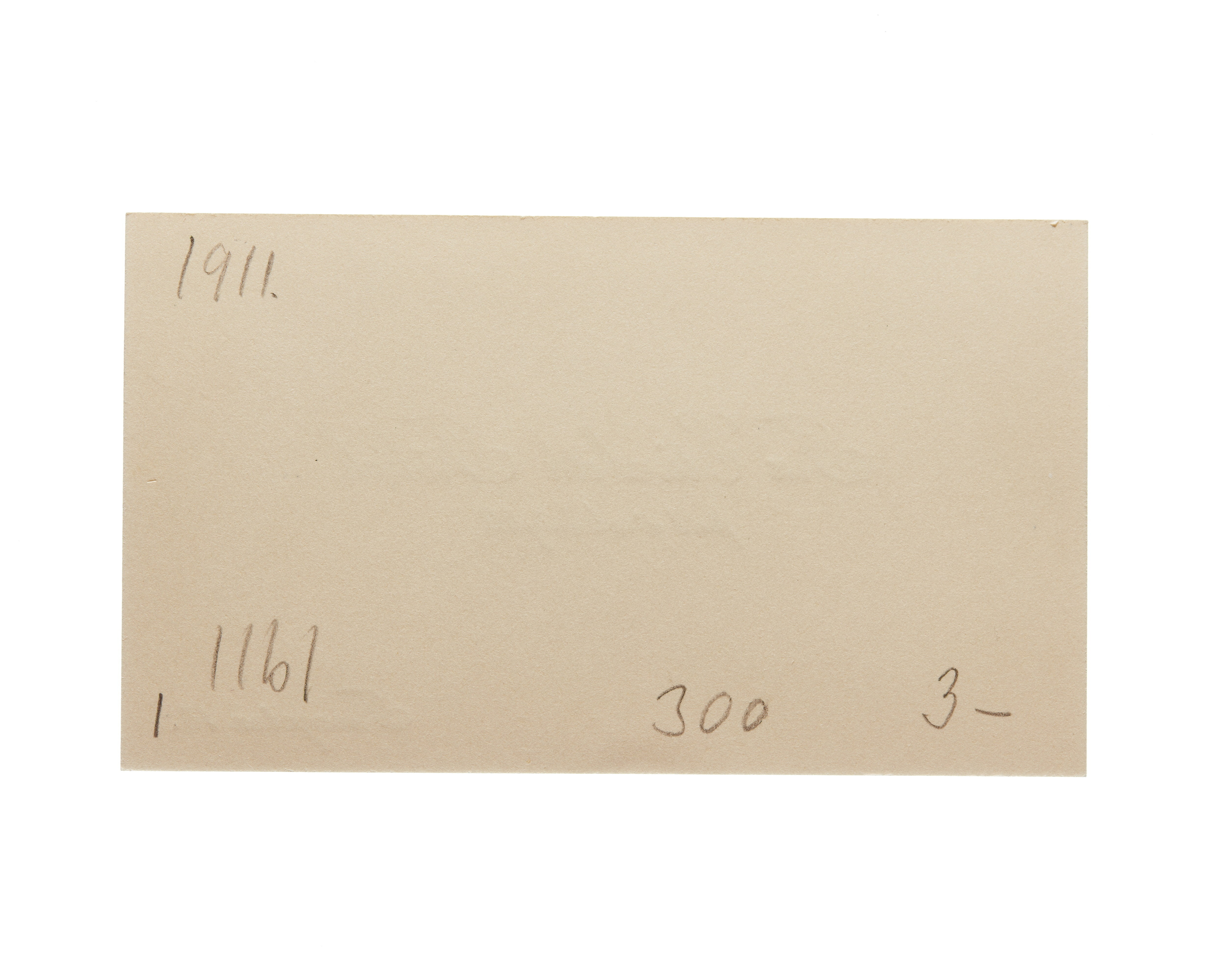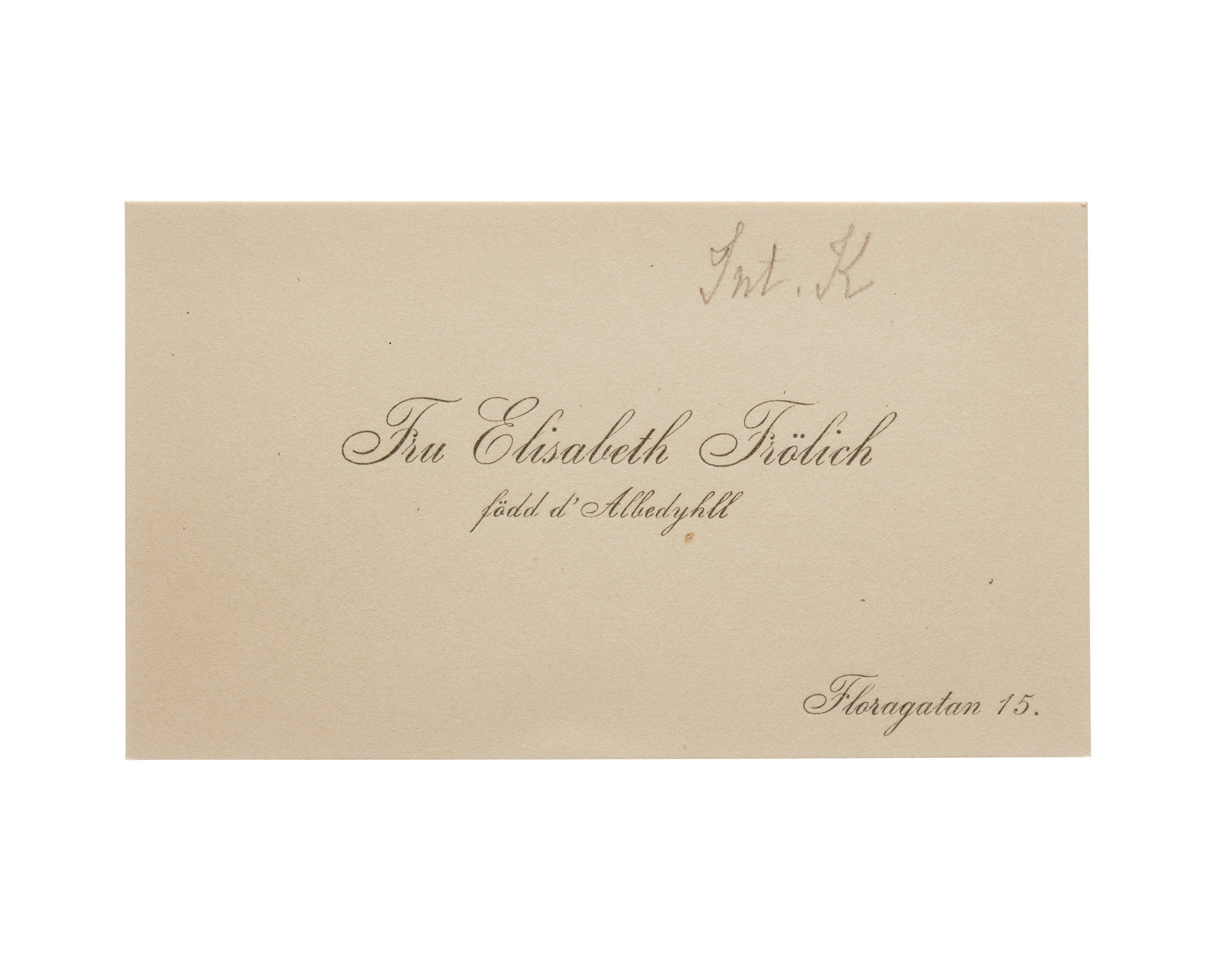 Ett visitkort från Elisabeth Frölich, f. d'Albedyhll, daterat 1911, adress (nedre högra hörnet) Floragatan 15. Överlämnat i samband med Internationella kvinnoförbundets kongress i Stockholm 1911.