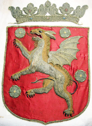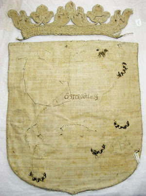 Östergötlands vapen, broderat för hästtäcke buret vid Karl X Gustavs begravning den 4 november 1660.