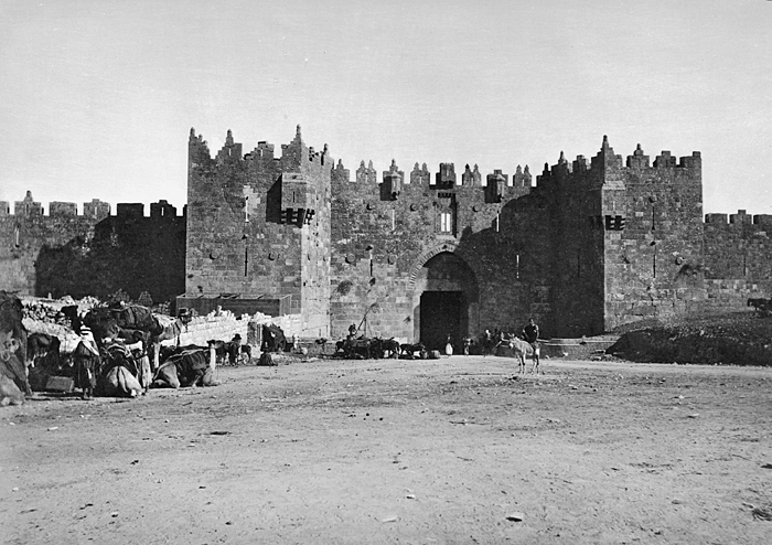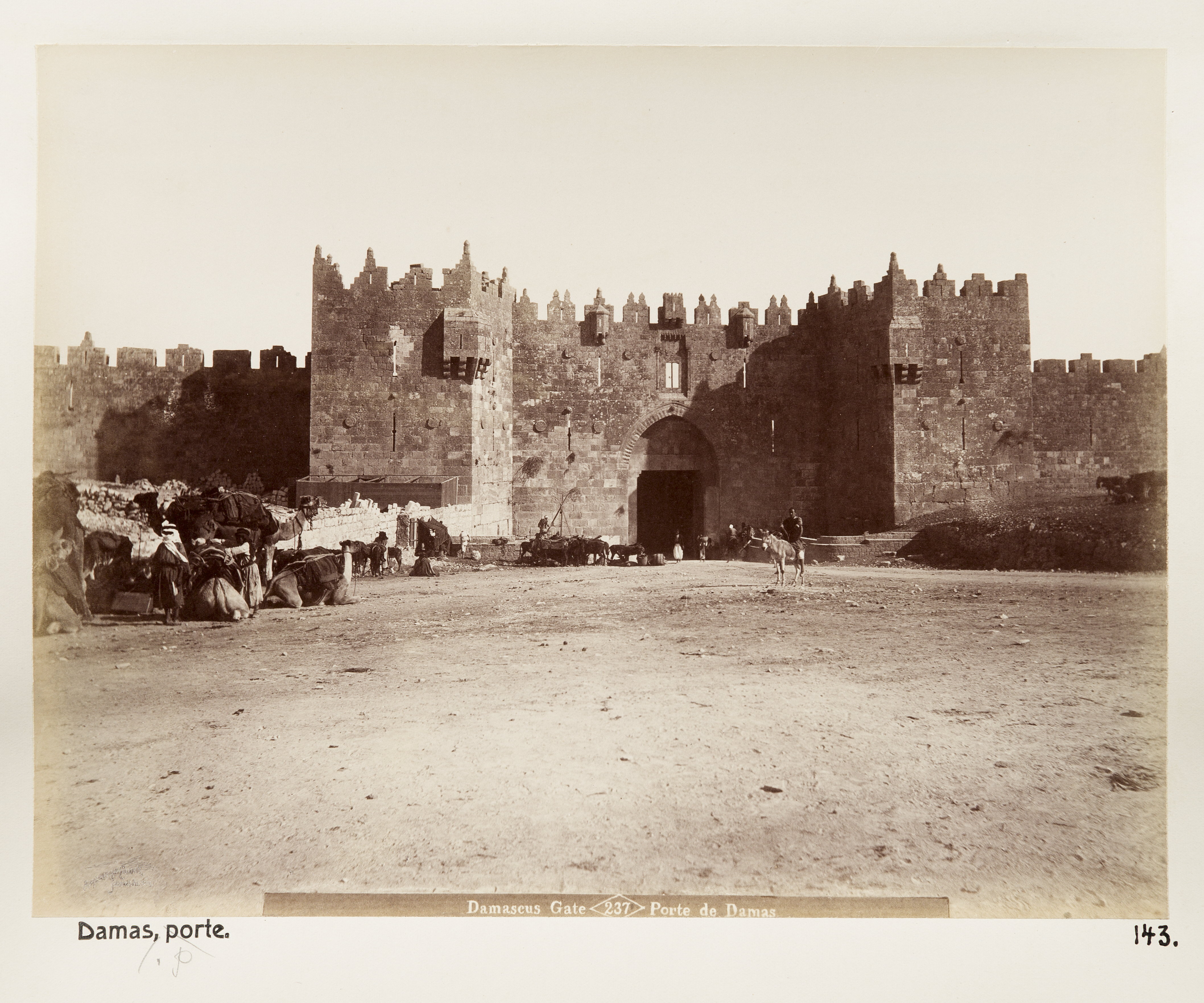 Damaskusporten i Jerusalem. Text på originalet: "Damascus Gate/Porte de Damas". Fotografierna LXVI:N.01.-180. kommer från resan till Palestina och Syrien som Wilhelmina och Walther von Hallwyl gjorde den 30 mars-27 april 1901. De lämnade Sverige den 5 november 1900 för Egypten, där de stannade till den 28 mars 1901, då de fortsatte till Palestina. Med på resan var Wilhelminas sällskapsdam, fröken Ida Uhse. Den 27 april fortsatte de till Turkiet och Mindre Asien. De mindre fotografierna (utom de från Samos) LXVI:N.90.-100. är tagna av Wilhelmina själv, under en resa till häst från Jerusalem till Damaskus 8-20 april 1901. Övriga fotografier är inköpta av Wilhelmina i Jerusalem, Damaskus och Beirut. Alla uppgifter kommer från Ida Uhses reseanteckningar.