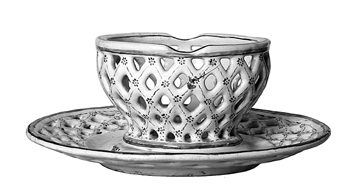 SKÅL med fast fat. Nästan halvsfärisk, i brädden två motsatta rundade insänkningar, fatet med snett uppåtriktat, något uppåtböjt brätte samt på fotkant; skålen samt brättet med genombrutet rombiskt rutmönster, bildat av flackstavar. Dekor: I muffelfärger på tennglasyr. Godset blekt gråbrunt. Utmed stavarna på skålens utsida samt fatets insida en vågig rand i rödgredelint, vid korsningarna avbruten av en enkel blomma med gul mitt och blåa blad; På fatet runt skålens nederdel sex stjälkar, varje med en enkel blomma i gredelint med gul mitt, i skålens botten en bukett med olika blommor. Runt skålens bräddkant två ränder i rödgredelint, på brädden utsida samt brättkanten en rand i samma färgliggande intill en i grönt, kring skålens nederdel en rand i rödgredelint liggande intill en i gult. På bottnens utsida en märkning i gredelint. Höjd 8 cm, diameter, skål 11,3 cm. Fat 19,3 cm.