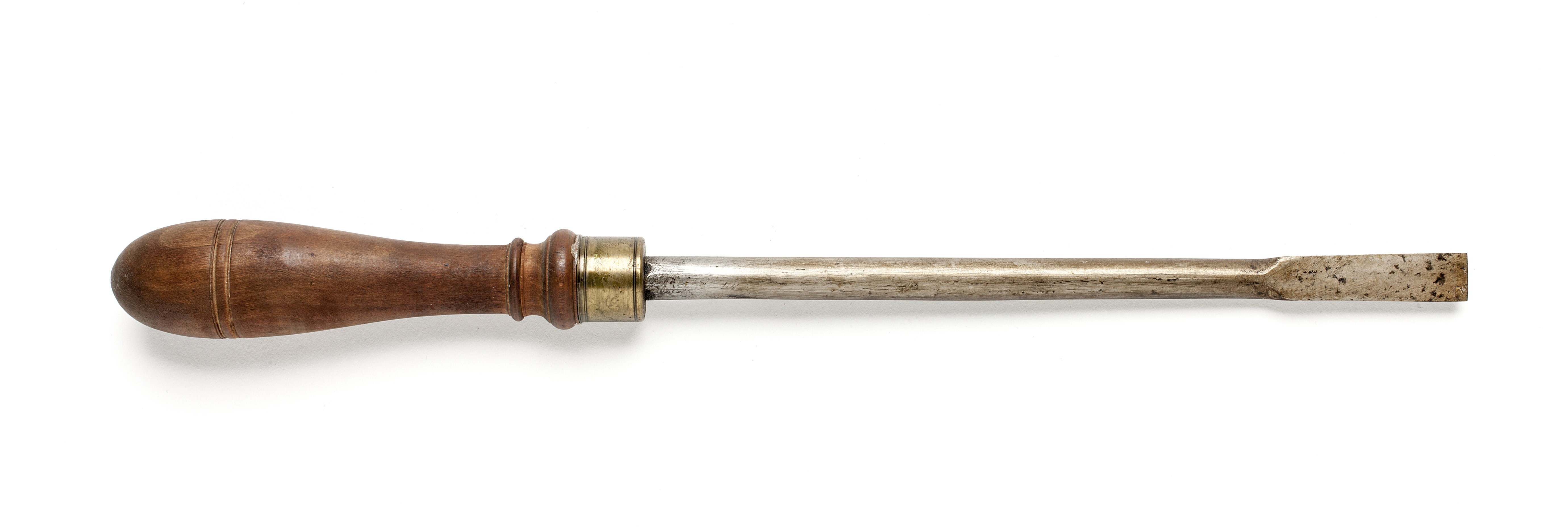 Rund klinga, i änden rektangulär genomskärning med två avfasade kanter. Svarvat skaft av päronträ med två vulster nedtill ("skoklostertyp"). Mässingsring.