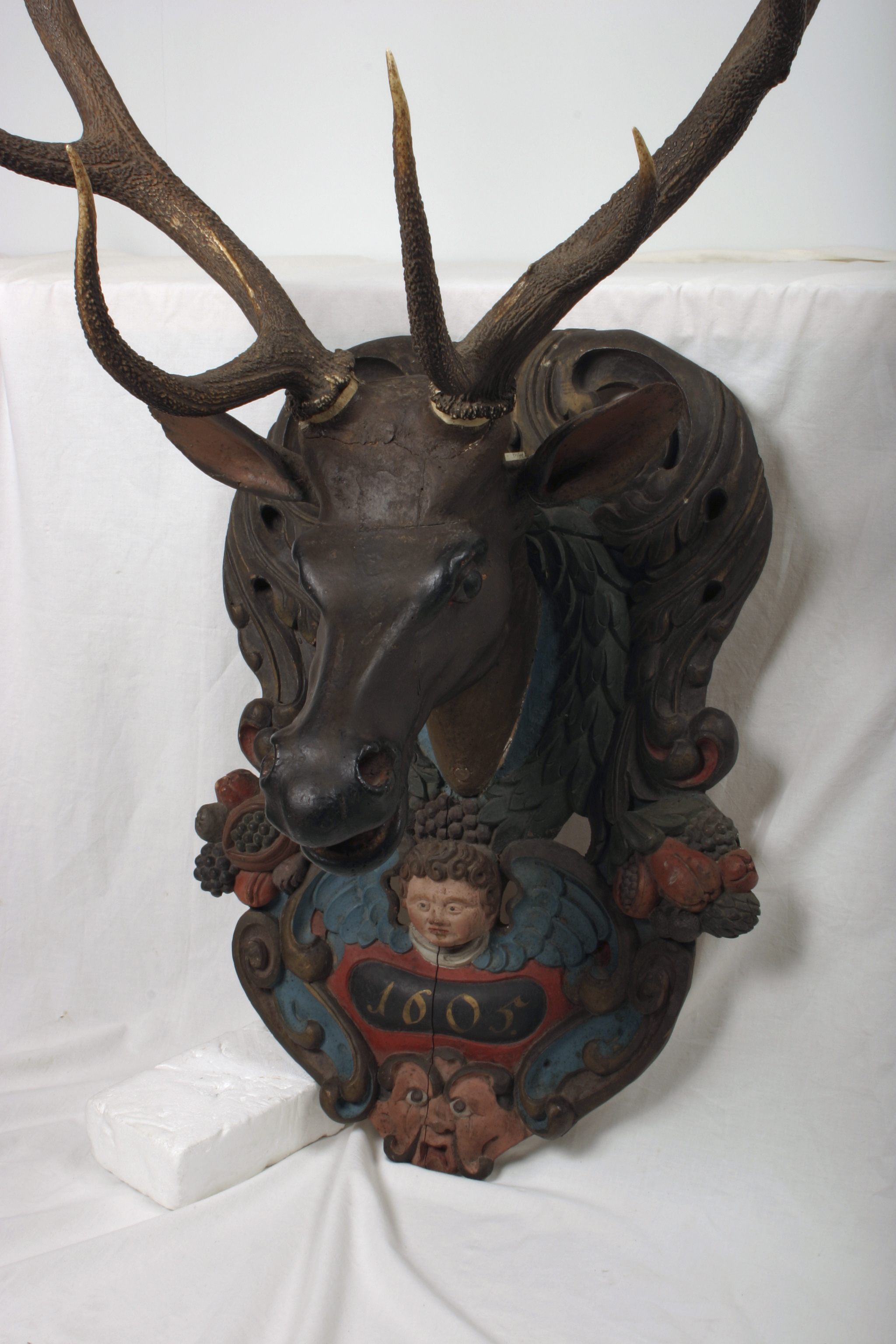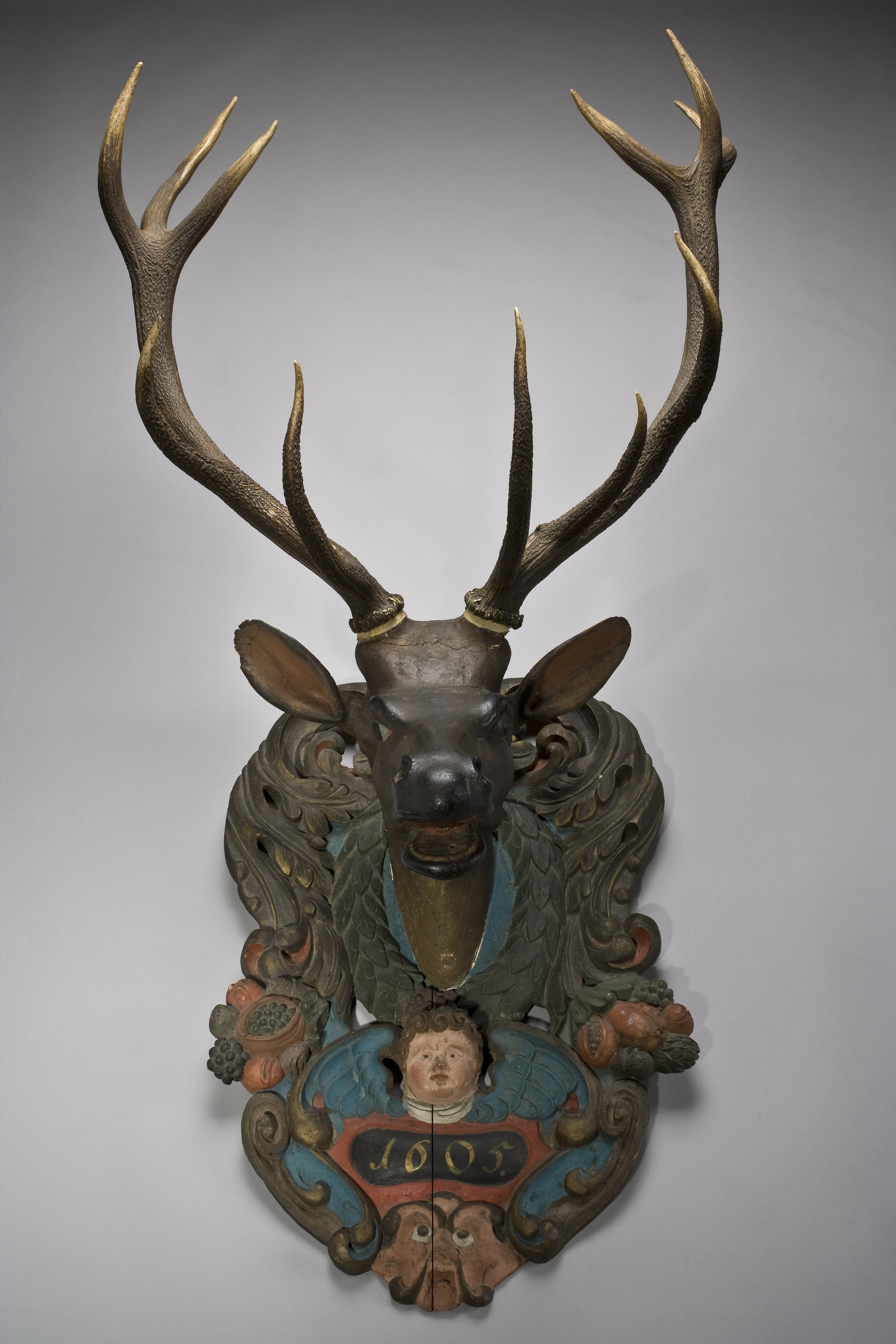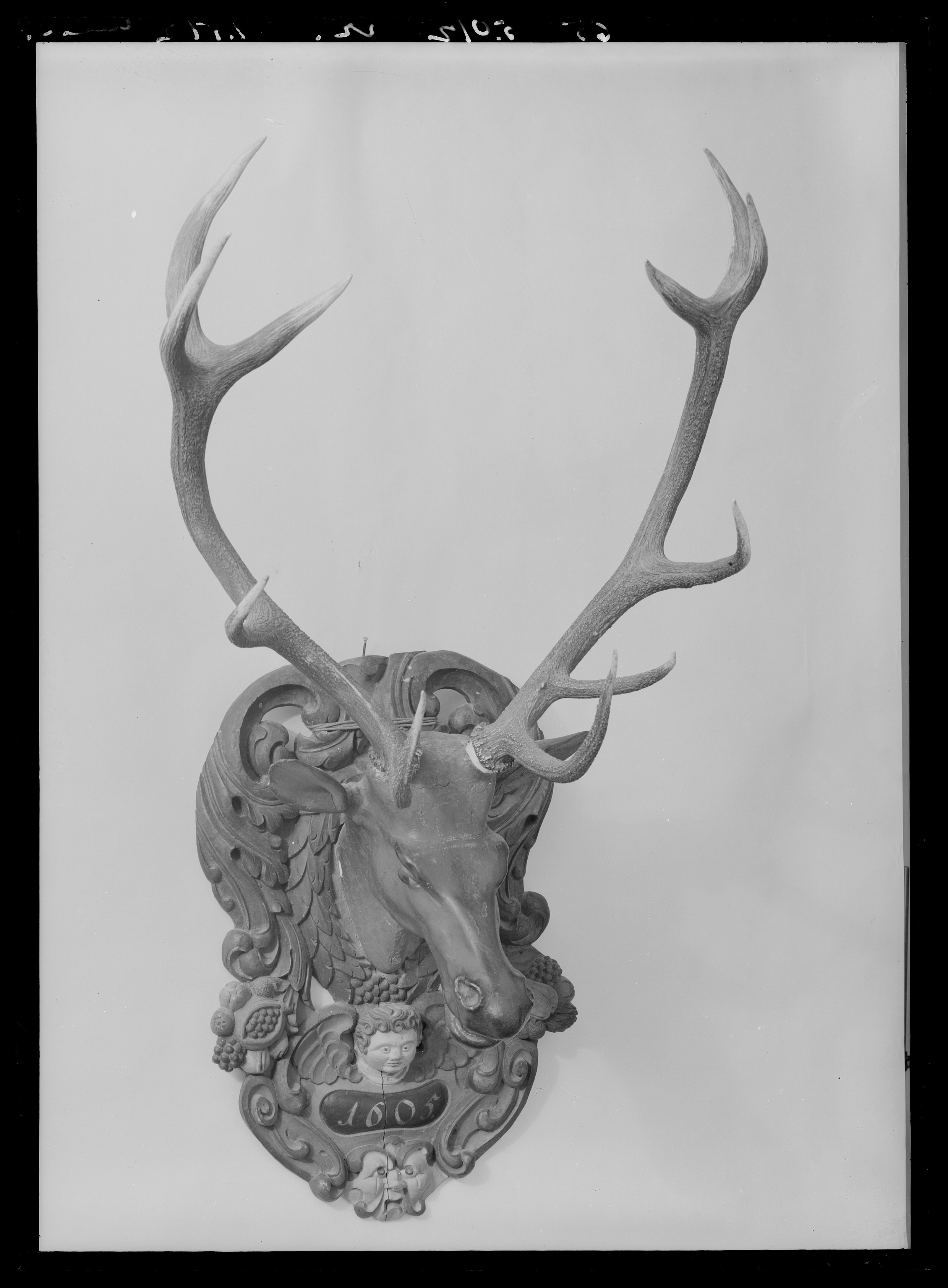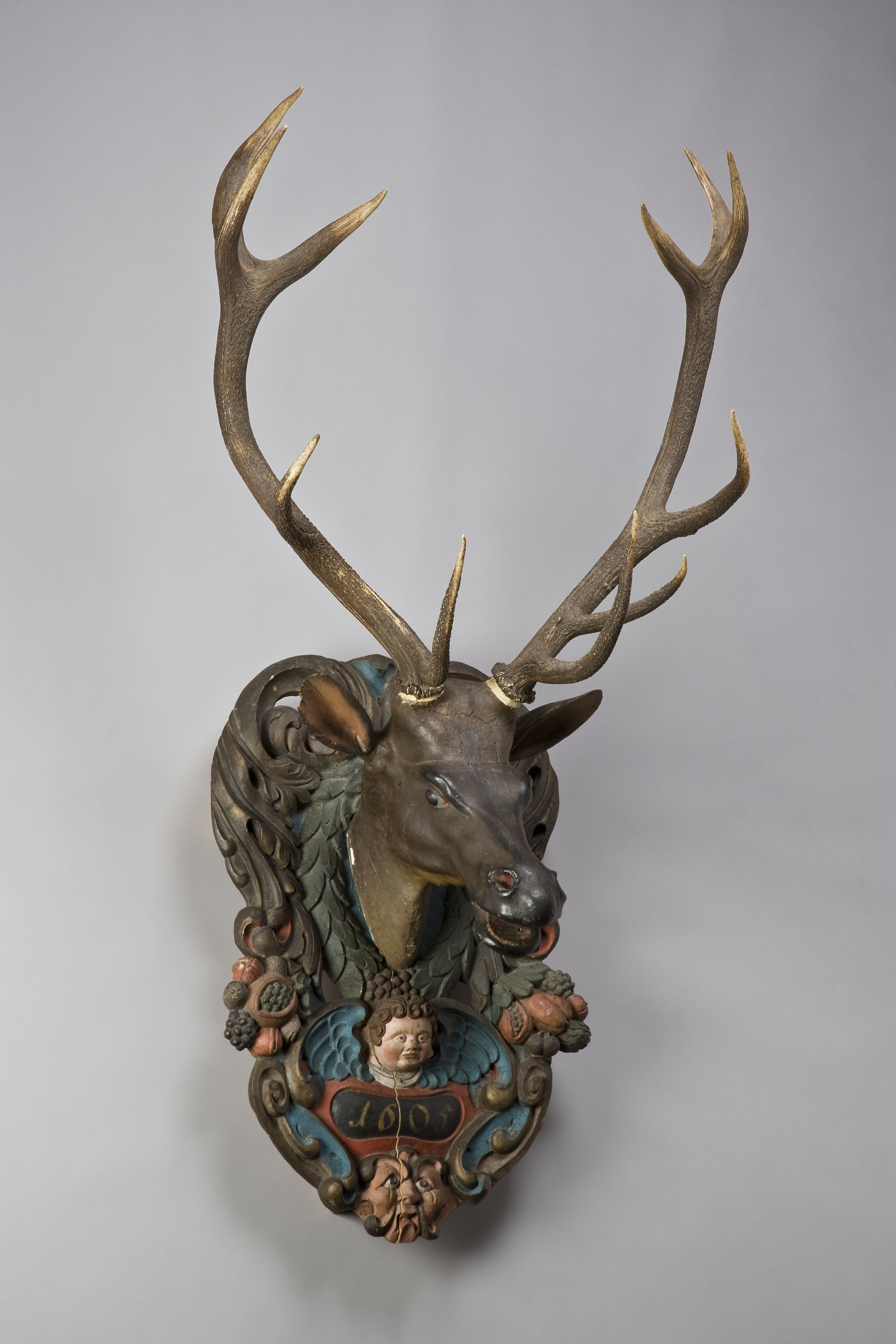 Jakttrofé med hornkrona från kronhjort, monterat på skulpterat huvud, daterat 1605.