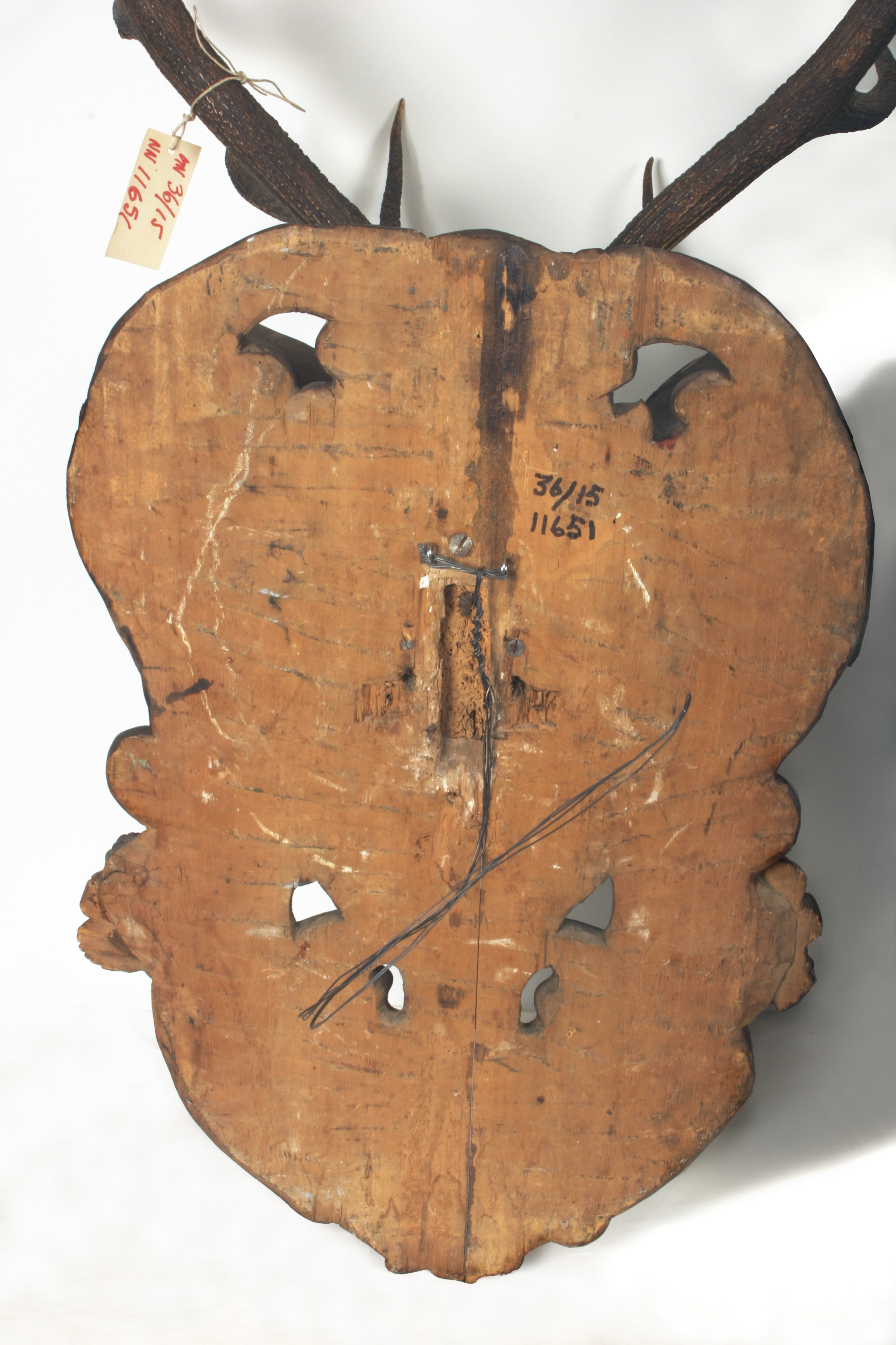 Stånglängd 800 och 810 mm, ögontaggarnas l: 350 och 370 mm, rosenkransarnas omkrets 200 och 210 mm, stängernas undre omkrets 130 och 120 mm, övre omkrets 115 mm, utlägg 570 mm. Hornkrona med elva taggar, fem på h. och sex på v. horn. Kronan monterad på hjorthuvud, skulpterat i trä och målat i brunsvarta färger. Huvudet i sin tur fäst på skulpterad platta, målad i brungrönt, blått, rött och guld. Blåmålad, oval mittplatta vid hjorthuvudet, omgiven av lagerkrans. Däromkring s-formigt svängda bladfestonger med fruktknippen, nertill rött och grönt. Nederst rullverkskartusch i blått och guld med maskaron, röd och brun samt kerubhuvud, blå vingar, brunt hår, naturfärgat ansikte. Svartmålat mittfält med årtal målat med guldfärg: "1605".
