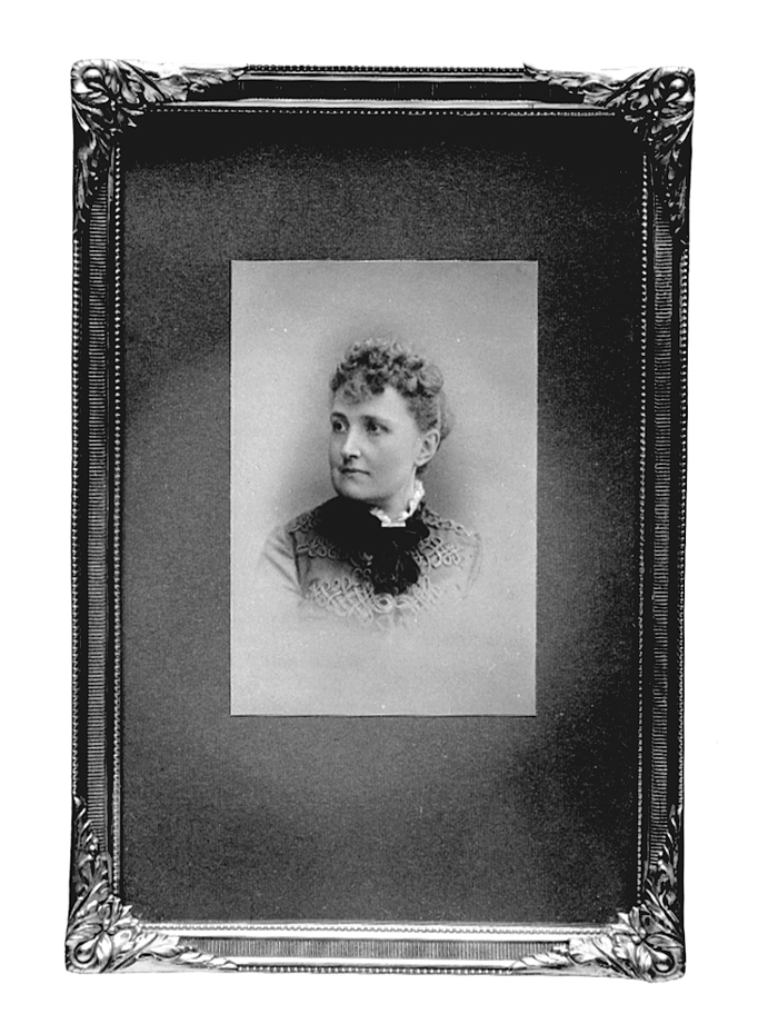 SIGRID MATHILDA TORSK. Midjebild, huvudet i halv profil åt vänster. I höghalsad liv med tvärgående snörmakerier, vitt halskrås och svart rosett. Kartong grågrön, fotografi stående raktangulär. Fotografi, höjd: 9 cm, bredd: 6 cm. Kartong, höjd: 16,3 cm, bredd: 10,7 cm. SIGFRID MATHILDA TORSK f. 9 februari 1841, d. 4 februari 1924. Innehavare av juvelerarfirman J. E. TORSK, Stockholm. Ram ny, av brons, rektangulär med snett inåtfallande profil. Kring in- och utkant en pärlstav och en slät list, mellan dessa en tvärrefflad botten. I varje hörn ett pålagdt bladornament, allt svagt grönoxiderad. På baksidan pappskiva med hörnstötta samt vadderad och klädd med brungult moirétyg. Skivan fasthållen med sex övervikna tvåflikade tungor. Originalglas, svagt kupigt. Höjd: 17,7 cm, bredd: 12 cm. Fotografien gåv till WILHELMINA VON HALLWYL f. KEMPE, år 1912 från fröken SIGRID M. TORSK, Stockholm. Ramen inköpt av WILHELMINA VON HALLWYL f. KEMPE 24 april 1929 hos CLAËS HULTBERG A-B., konsthandel, Kungsgatan 9 & 11, Stockholm. Betald: 24 april 1929. Pris: 10 Kr.