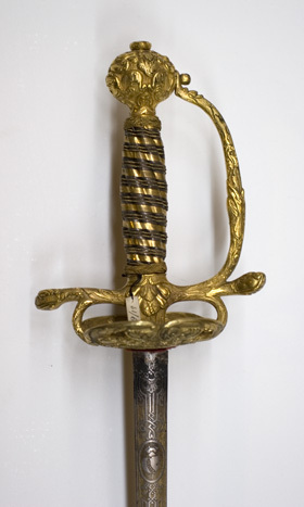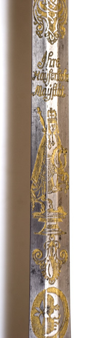 Fäste av förgylld mässing med ciselerad dekor. Rund knapp med odjur, frukt och blad. Plan nitknapp. Handbygel med ormhuvud på mitten, fastskruvad i knappen. Horisontellt s-formiga parerstänger, avslutade som ormhuvuden. Två fingerbyglar, avslutade med ormhuvuden. Krysset med ciselerade blad. Njurformiga, något kupiga parerplåtar, den inre något mindre. Parerplåtarna genombrutna med växtdekor, inramad av odjurshuvuden, lika på över-och undersidan. Kavel med kransar, flätade av förgylld, tvinnad mässingstråd. Kaveln snett horisontellt räfflad, lindad med smal, platt, förgylld mässingstråd omväxlande med silvertråd och förgylld, tvinnad mässingstråd. Mittpå kavelns utsida Karl XV:s krönta namnchiffer av pånitad silverplåt. S.k. kurfursteklinga, rak, tvåeggad, baspartiet rundslipat, resten sexsidig. Hela klingan med etsad dekor, omväxlande utsparade ornament mot förgylld, skrafferad botten och nedetsad, förgylld dekor. Utsida:Vid basen ett rektangulärt, förgyllt parti med utsparade banddekor och medaljong med kvinnohuvud (?) med lagerkrans. Därovanför: månskära med ansikte och stjärna i oval samt kurfurstebilder: 1 - ryttare vänd höger i mantel med kejsarkrona och spira "Ihre // Kaijserliche // Maijstät"; 2 - ryttare vänd vänster, mantel och kurfurstehatt, "Chur // Maintz"; oval med personifierad sol; 3 - kurfuste som 2, vänd h, "Chur // Cöllen"; oval med flätverk; 4 - kurryttare som 2, vänd v "Chur // Trier"; oval med sexuddig stjärna; 5 - kurryttare som 2, vänd h, riksäpple, "Chur // Bairn", trofegrupp o bandornamentik, oval med 8-bladig blomma. Insida: Samma dekor men med andra kurfurstar. Från basen 6 - kurryttare vänd v, svärd, "Chur // Sachsen"; rankornament; 7 - kurryttare vänd h, spira, "Chur // Branden // burg"; oval med sol; 8 - kurryttare vänd v, krona (?) "Chur // Pfalz", oval med flätverk; 9 - kurryttare vänd h, riksbanér, "Chur // Brunswig // Lüneburg"; oval med sexuddig stjärna; 10 - stående figur i antikiserande dräktfas, h hand sträckt åt h framför kroppen med stridsklubba (?) "Hanibal"; trofégrupp etc som på utsidan.