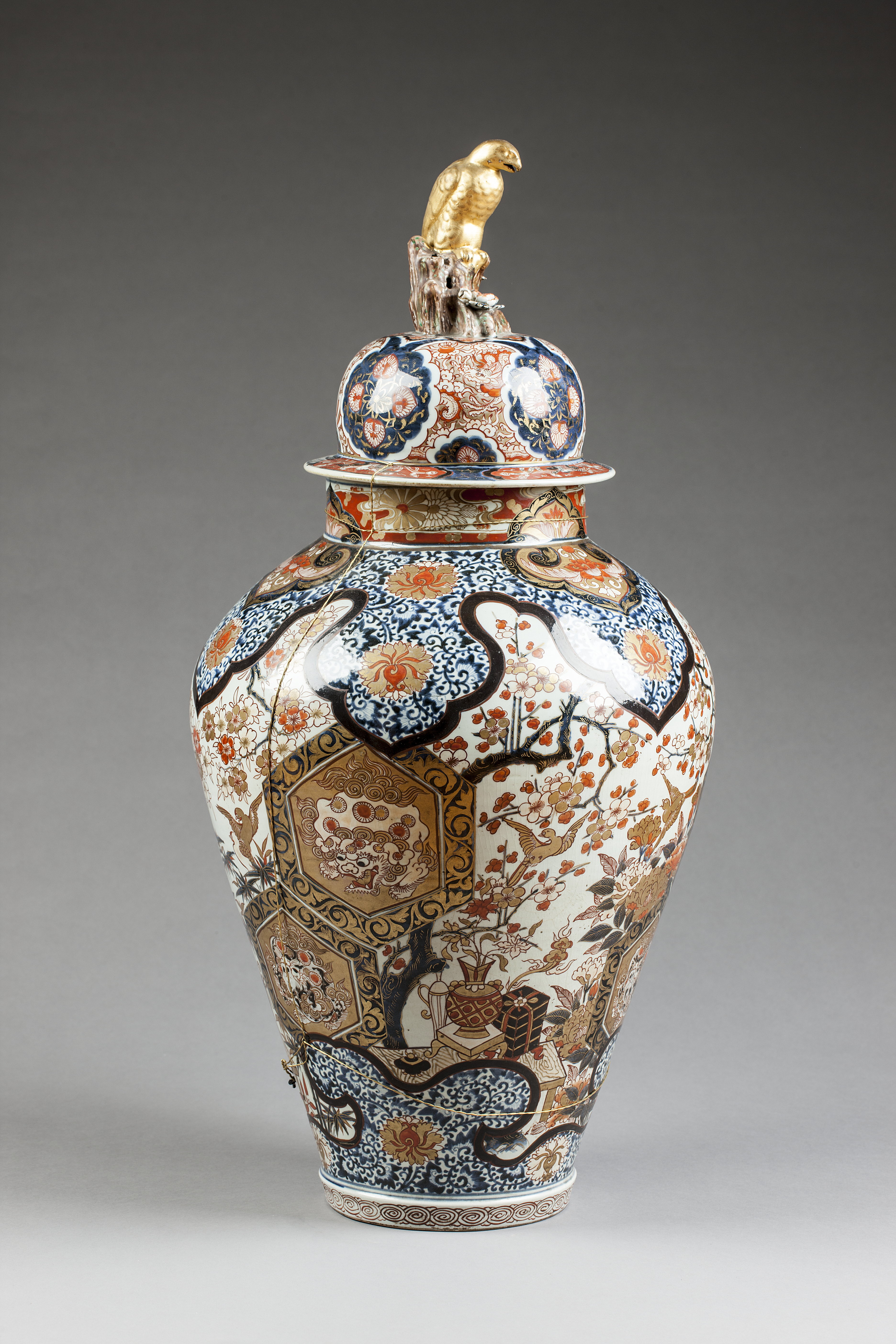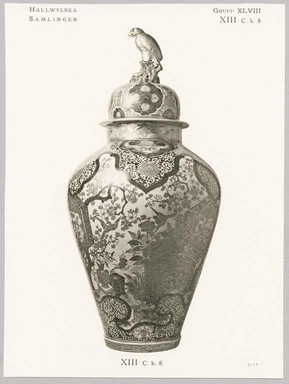 - Omvändt päronformig, med rakt uppstående hals samt å något utstående fotkant. Lock (från en annan urna) kupigt, med snedt utåtfallande, rakt brätte, rak låg sarg samt knopp i form af en örn å en klippa. Dekor: Flerfärgad målning. Rundt skuldran en lambrequinbård med sex nedåtvända flikar, begränsade af en svart rand mellan två brunröda; i tre flikar ett stort ju-i-ornament, hvars öfre del sträckande sig upp å halsen, ornamentet begränsadt af blad i guld mot blå botten och fylldt med en uppåtvänd och två nedåtvända blommor samt blad, allt i brunrödt och hvitt mot förgylld botten; mellan ornamenten två pioner och under desamma en pion, dessa i guld med midt och uppvikningar i brunrödt, allt mot bottenmönster af blad och band-formiga ornament i blått. Å halsen mellan de uppskjutande ornamenten två krysante-mumblommor och blad i hvitt och guld samt knoppar i brunrödt, mellan blommorna molnslingor i brunrödt och guld, upptill en blå rand. Nedtill lambrequinbård som rundt skuldran, flikarna här dock fyra, af annan form samt uppåtvända och med endast en pion i hvarje flik, af pionerna två som föregående och två i blekt ljusrödt och guld. Mellan lambrequinbårderna på tre ställen två sammanhängande sexsidiga falt snedt öfver hvarandra och begränsade af en bred bård af guldblad mot blå botten samt dekorerade med en hopkrupen hund eller ett lejon (Karashishi, motsvarande kinesernas Fos hund) mot förgylld botten, hunden med öppet gap och stirrande ögon, vänd åt vänster, i öfre fältet med hufvudet nedåt, i det nedre uppåt; den förra i blekt ljusrödt med runda fläckar i brunrödt och guld, man, svansplym och hårtofsar i guld; den senare i grått och svart, för öfrigt som föregående. Mellan fälten: Å ena sidan: Till vänster ett prunusträd med stam i blått och guld samt blommor i blekt ljusrödt, brunrödt och guld; till höger pioner i blekt ljusrödt och guld eller brunrödt och guld samt blad i blått och guld; mellan blommorna två flygande fåglar, den ena vänd åt vänster, den andra åt höger, båda i guld med brunröda konturer. I förgrunden ett bord i blekt ljusrödt och guld, å detsamma: en stor vas med rutmönster i brunrödt, i hvarje ruta en rundel i samma färg mot botten i guld, vasen å ett för-gylldt fotställ, i densamma en brunröd blomma samt blad i guld, till höger ett ställ med askar(?) i svart och guld, ombundet med band i brunrödt och guld, bakom detsamma ett föremål, liknande en kinesisk ju-i-spira, i brunrödt och guld, till vänster en hög vas i blekt ljusrödt och guld samt en liten rökelseask i svart och guld. Å andra sidan: Till vänster ett träd med stam som föregående, däremellan blommor och blad i brunrödt och guld; till höger granatäpplen och knoppar i blekt ljusrödt, brunrödt och guld samt blad i hvitt, streckade i rödt, eller dylika i blått, streckade i guld. I förgrunden ett bord som föregående, å detsamma: å ett förgylldt fotställ en stor bukig urna med rutmönster i brunrödt, i hvarje ruta en rundel i samma färg mot botten i guld; en svart smal vas, hvari en blomma i guld; en lägre urna med S-formad henkel samt ett föremål, liknande en kinesisk 7'u-j-spira, allt i brunrödt och guld; till vänster ett rökelsekärl i guld å ett högt ställ i blekt ljusrödt samt en rökelseask i guld. Å tredje sidan: Till vänster ett persiketräd med stam och blommor som prunus-trädets samt med blekt ljusröda blad, till höger bambublad i blått, brunrödt och guld samt två fåglar, den ena sittande vänd åt vänster, i blekt ljusrödt och guld, den andra flygande åt höger, hufvudet vändt åt vänster, fågeln i guld med brunröda konturer, en tredje fågel högt uppe till vänster vid persiketrädet, flygande åt höger, hufvudet vändt åt vänster, fågeln i färg som den sistnämnda. I förgrunden ett bord som föregående, å detsamma: en blomkruka i blått och guld, hvari en klippa i samma färger samt bakom denna liljor och blad i blekt ljusrödt, brunrödt, blått och guld; en ask i brunrödt och guld samt ett ställ eller dylikt i svart, brunrödt och guld. Rundt fotkanten en bård af sammanhängande spiraler i brunrödt. Lock: Å kupan fyra falt i form af granatäpplen i blått, hvari fyra lökformiga ornament i brunrödt och blekt ljusrödt, omgifna af blom- och bladornament i guld. Mellan fälten nedtill ett litet falt, liknande föregående men synligt endast till hälften, ofvanför detsamma bottenmönster i brunrödt, guld och blekt ljusrödt: på två sidor en drake, endast delvis synlig, å ena sidan till vänster, å den andra till höger, rundt draken blommor och moln; på två sidor blom- och bladornament. Upptill en lambrequinbård med åtta nedåtvända flikar, kantade af en svart rand mellan två brunröda, i flikarna blomornament i brunrödt mot botten i guld. Å brättet en bård med fyra liggande aflånga fält med svartkantade konturerade ändar, i fälten en flygande fågel (Hö eller Höhö, motsvarande kinesernas Fågel Fenix, Feng), sedd framifrån och med åt sidorna utbredda vingar, fågeln i hvitt, svart och guld mot brunröd botten; mellan fälten ornament i guld mot blå botten; bården begränsad af en blå rand. Örnen (knoppen) förgylld, sittande och med något nedåtböjdt hufvud, fjädrar och vingpennor i relief; klippan marmorerad i brunt och grönt, i fri relief å densamma två blommor, knoppar och blad, med brunröd målning å blommorna och blå å bladen. Den blåa färgen under glasyren, öfriga färger på densamma, guldet å fågeln obrändt samt döljande bränd dekor i ljusbrunt. Höjd: 87.5 cm.; utan lock, höjd: 61 cm.; diameter: 43 cm. Hals, diameter: 21 cm. Fotkant, diameter: 21 cm. Lock, höjd: 27 cm.; diameter: 25 cm. Anm. Guldet nött. Gåfva till Wilhelmina von Hallwyl, f. Kempe, Julaftonen 1907 från hennes mor, Johanna Kempe, f. Wallis 13 September 1818, d. 15 April 1909. Inköpt af den sist