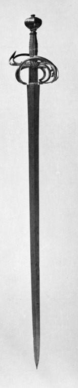 Bygelfäste, förgyllt med påslaget guld. Knapp tryckt, päronformig, åttsidig, nitknapp låg. Pareranordning söndrig, sammantryckt från ut- och insidan, på utsidan saknas den inlagda parerplåten och en övre sidobygel, på insidan saknas likaledes den inbyggda parerplåten, en övre sidobygel är avbruten och löst tillfogad med tunn ståltråd. Pareranordningen består av kraftigt svängda parerstänger, den främre uppåt-utåt, den bakre nedåt-inåt, ändarna vidgade, platta med hoprullade ytterändar, höga fingerbyglar, från vilka utgår rundade byglar (urspr. omfattande parerplåtarna). Krysset triangelformat med nedåtriktad spets, ornerat med vinkelställda räfflor. Kaveln med vertikalt räfflad trästomme, lindad med mycket tunn, förgylld silvertråd, upptill och nedtill en krans av flätad, tunn koppartråd. Klinga rak, tvåeggad, slipad med två varandra mötande skär och med 52 mm lång ricasso spetspartiet med markerat formad, smal udd. Ricasson på båda sidor med tre längsgående, grunda räfflor, i de båda yttre av dessa punsad klingsmedssignatur: " CLEMENS + DEINGER " (Clemens Dinger, verksam i Solingen ca 1620-1640). I mellanräfflan en stämplat en svan med S-formigt böjd hals (LRK vägledning 1921:28)