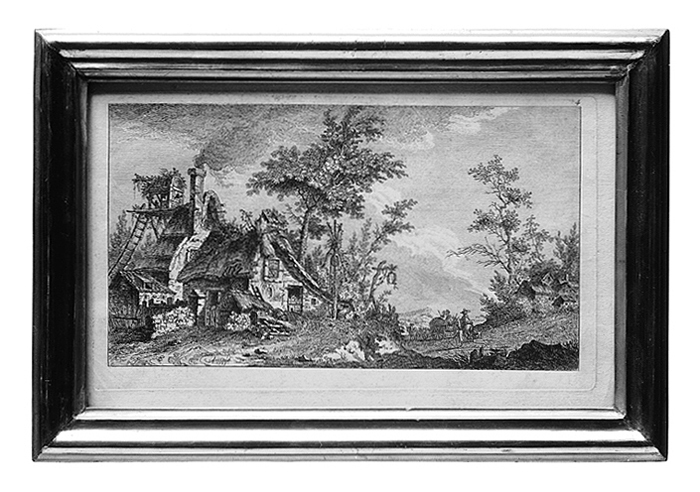 - I förgrunden till vänster å framåt sluttande mark två til! större delen förfallna bondstugor under halmtak, den främre med bortre takfallet längre framskjutande, å hitre gafveln en dörröppning, ett röstfönster samt under detta en rundbågig öppning, å taknocken vid hitre ändan en burliknande påbyggnad under sadeltak, på ömse sidor om denna en halmkärfve. Vid hitre knuten ett lågt skjul, å hvars framsida en låg dörröppning, till höger om denna en hög af brädstumpar, en låg korg och en tunna, vid bortre gafveln en upprest stege. Det bakre huset något högre, med liknande tak, å detta vid främre ändan en rykande hög skorsten, vid den bortre å en ställning en fågelbur eller ett dufslag samt en mot ställningen från marken upprest stege. Hitom huset ett lägre dylikt med tegeltak och takkupa, därframför ett plank och en häck (?). Invid det förstnämnda husets bortre knut en hissinrättning, bestående af ett mellan ett par stolpar sittande hjul eller en trissa, å hvilken löper en lång lina; invid stolparna ett kar eller en afsågad tunna. Därbredvid hängande på en vinkelarm en krans (värdshusskylt) samt därbakom några höga träd. I midten en sänka, i denna en väg, hvarå ett af en häst bortåt draget hölass med två otydliga figurer. Efter lasset en ridande och en gående man jämte en hund samt före detsamma en ridande man. Längst till höger på en höjd fyra låga hus under sadeltak samt omgifna af träd och buskar. I bakgrunden höjder. Himlen molnig. Ljuset från höger. Nedtill till vänster signerad: Öfver högra öfre hörnet: 4. Höjd: 0.154 m.; bredd: 0.262 m. Blad, höjd: 0.183 m.; bredd: 0.285 m. Louis Le Sueur, f. 1746 i Paris, verksam ännu 1803; landskapsmålare och etsare; studerade i Paris, for sedan till Italien och bereste därefter Frankrike och England. Enligt G. K. Nagler: »Neues allgemeines Kunstler-Lexicon etc.», Siebzehnter Band, Miinchen 1847. Antagligen ur någon serie landskapsvyer, hvaraf denna är N:r 4; teckningen eller plåten gjord 1775. Ram (ny): Af trä, förgylld i matt och blankt. Profil som figuren (orig. 8/i): Crl Glas. u_Qoi9—J Rygg af brunbetsad poppel. Höjd: 0.226 m.; bredd: 0.330 m. Emottagen af Walther von Hallwyl som arf efter hans föräldrar, Theodor och Cecilie von Hallwyl, f. von Im Hoff, Rörswyl vid Bern, Schweiz. Ankom 26 Maj 1894, se Rescontra (Walther von Hallwyl). Kända tidigare ägare: 1. Godsägaren Balthasar Abraham von Im Hoff, Rörswyl, Bern, Schweiz, f. 24 Januari 1773, d. 16 September 1859, och dennes maka, Marie Catharine, f. VON Haller 1787 (döpt 30 April 1787), d. 15 Januari 1863, gifta 28 Mars 1811. 2. Margarethe Cecilie (Cécile) von Hallwyl, f. von Im Hoff 4 Juli 1815, d. 18 Maj 1893, dotter till föregående, gift 5 April 1834 med Theodor Hans Walther Hugo von Hallwyl, f. 24 Juli 1810, d. 13 December 1870. Ramen utförd efter beställning af Wilhelmina von Hallwyl, f. Kempe, 15 Januari 1895 hos förgyllaren Aug. Dahlstedt (f. d. G. Lönnmark), Sergelgatan 2, Stockholm, se räkning 5 Juni 1895. Betald 7 Juni 1895, se Rescontra (Walther von Hallwyl), 5 Juni 1895 räkning. Pris: Kr. 5, se räkning.