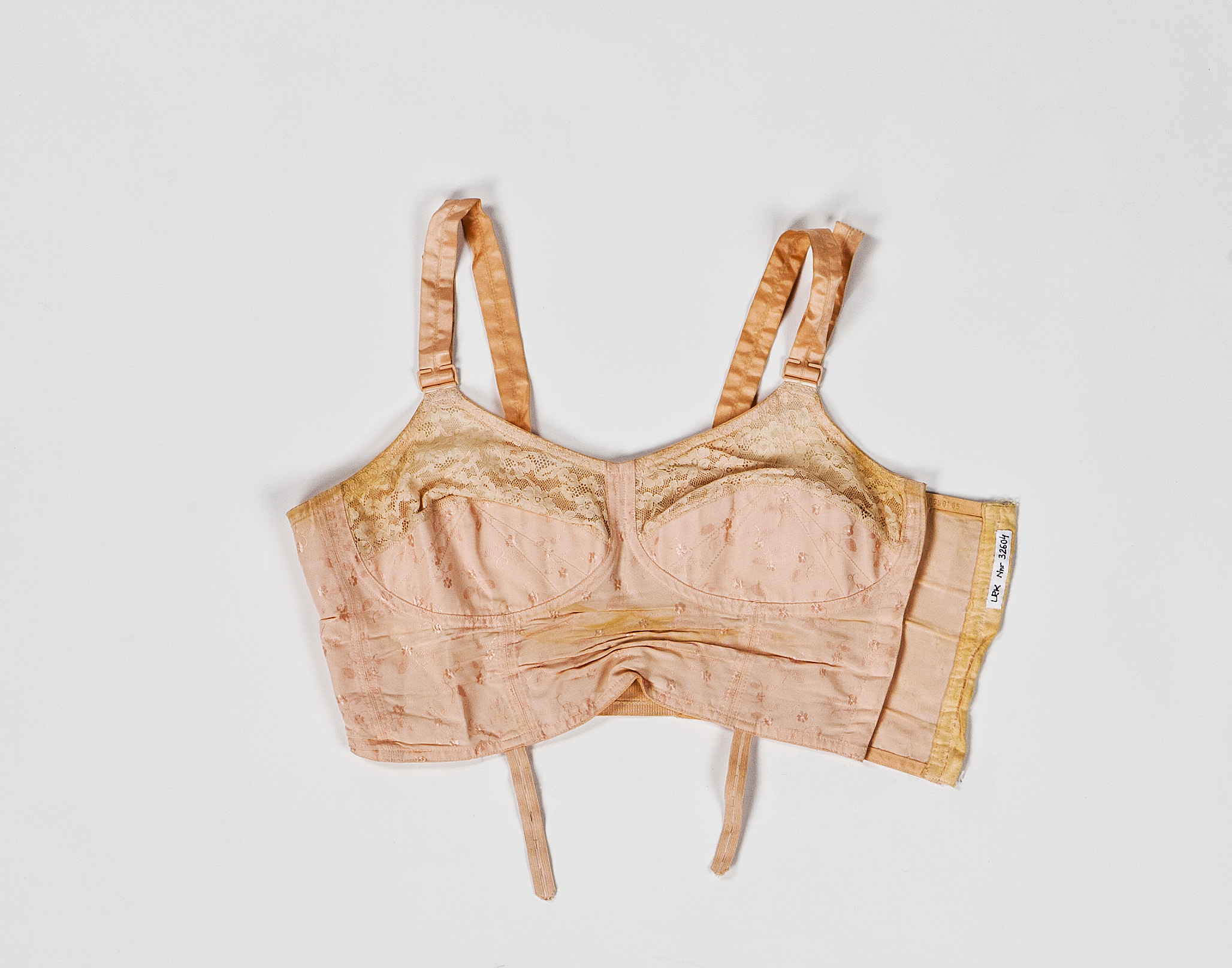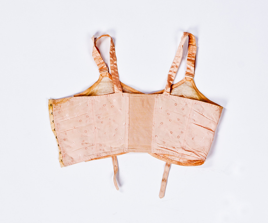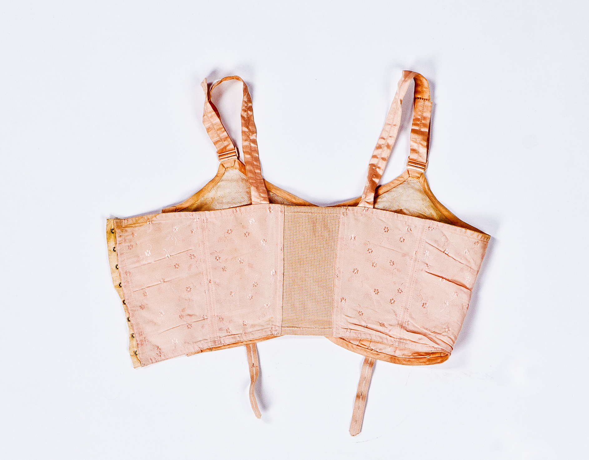 BH i rosa kraftigt siden i hög stadig modell av märket GERMA. Knäpps i vänster sida med åtta hyskor och hakor. Mitt bak är ett ca 8 cm brett stycke i resår. Annars sydd i stumt tyg. Blommönster i tyget. Övred delen av själva bysten är i rosa spets. Förstärkning i bomullstyg på undersidan av bysten, på avigsidan. På flera ställen är BH:n förstärkt med bomullsband. Axelband i siden vars längd kan varieras med ett spänne på framstycket. Framtill i kanten nedtill sitter två resårband med färdiga knapphål, troligen att knäppa fast höfthållaren i. Märkt upptill på bakre vänstra insidan med " 8 M6ES 104 841 0550165 "