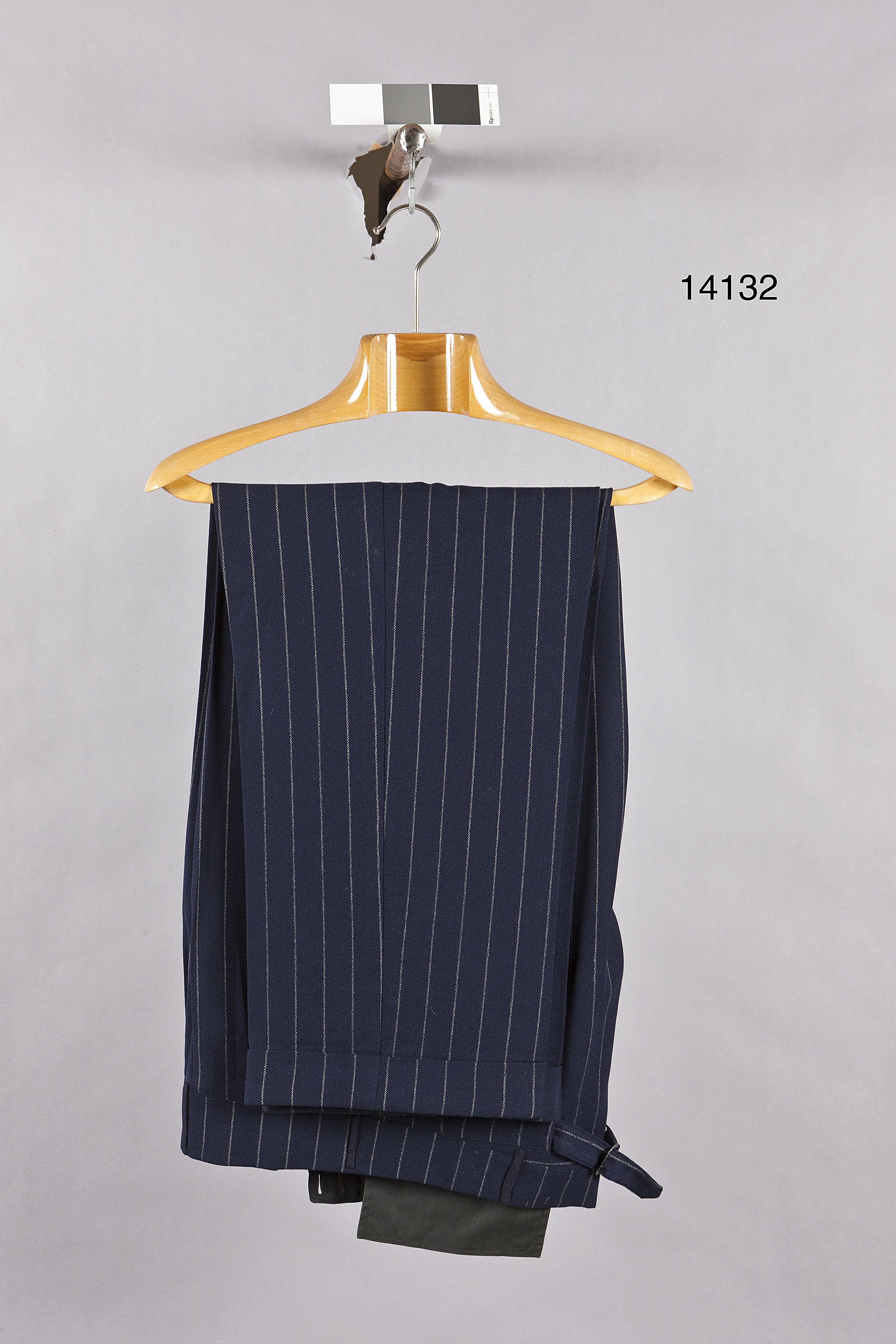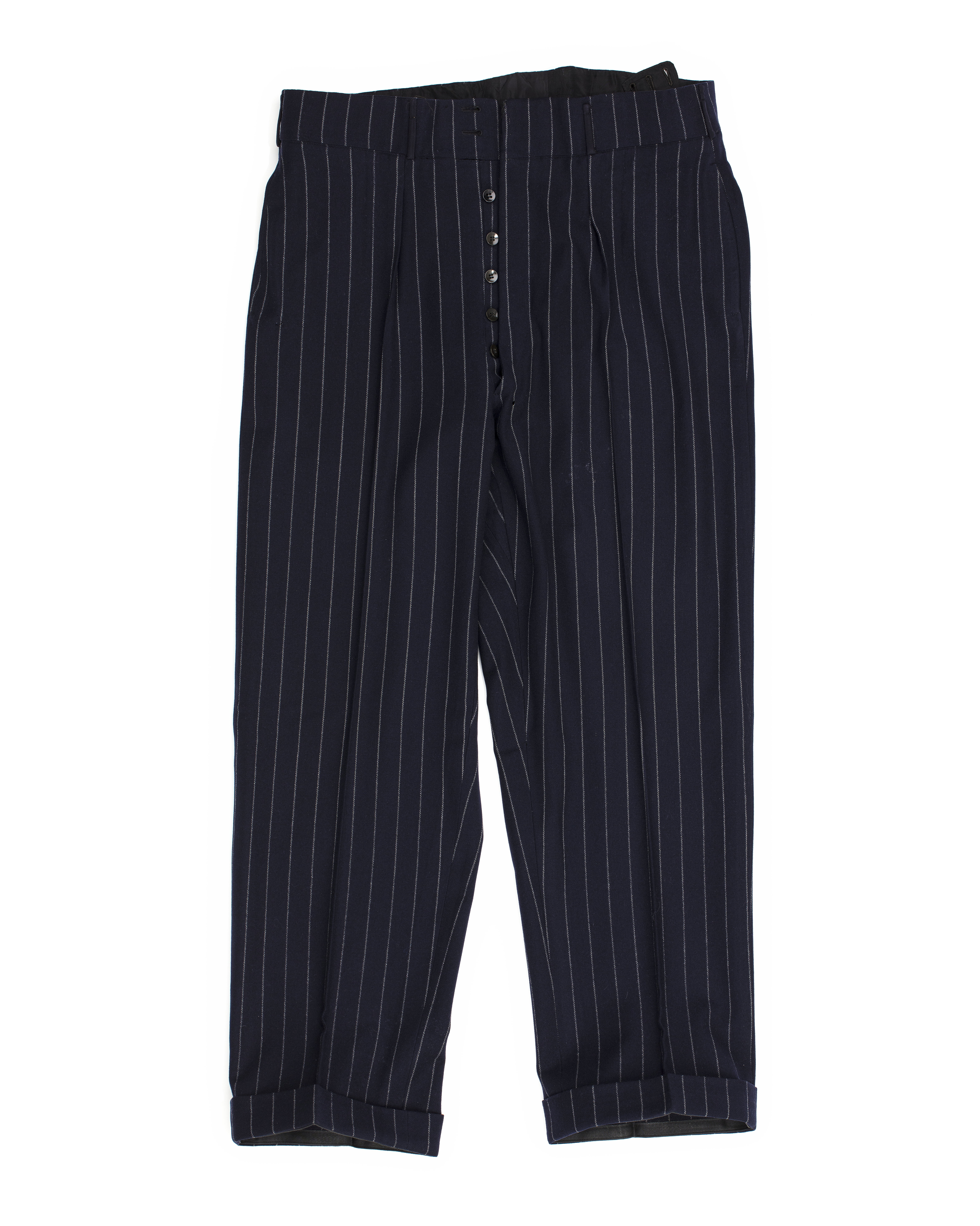 Långbyxor av mörkblått ylle med glesa smala vita ränder. Knäppt med gylf med åtta små släta svarta knappar. Linningen knäppt med tre knappar, dessutom sju hällor för skärp. Mitt bak spänntampar fästade i sidsömmen. 45 mm breda uppslag nedtill på benen. Foder i linningen av svart siden. Foder av svart bomull. Anm: Förkortningen S-t på etiketten avser skrädare Sandkvist som först var anställd hos Nilsson & Lindman och sedan flyttade till NK, varför kungen började beställa där. Allt enligt uppgift av kammartjänare Lindell 19740311.