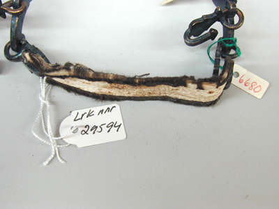 Hälrem av vitt skinn. Remmen är runt om kantad med ett svart (mörkbrunt) sidenband vikt runt remmens ytterkant. Bandet har på undersidan i ytterkanten en rand i ljusare brunt. I var kortände finns ett runt hål och en uppslitsning.