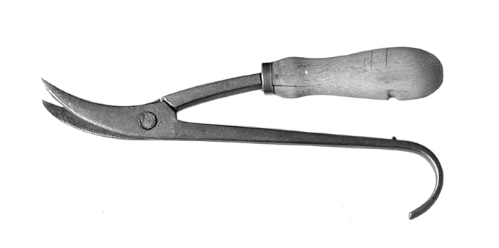 KONSERVBRYTARE Av stål. I form av en sax med bågformiga spetsiga korta blad. Skänklar fyrsidiga, avsmalnande utåt, den undre med ytteränden bågformigt omböjd nedåt, på den övres yttterände ett svarvat träskaft, långsträckt päronformigt, med en mässingsring kring inre änden. Längd: 16,8 cm.; bredd: 5,2 cm.