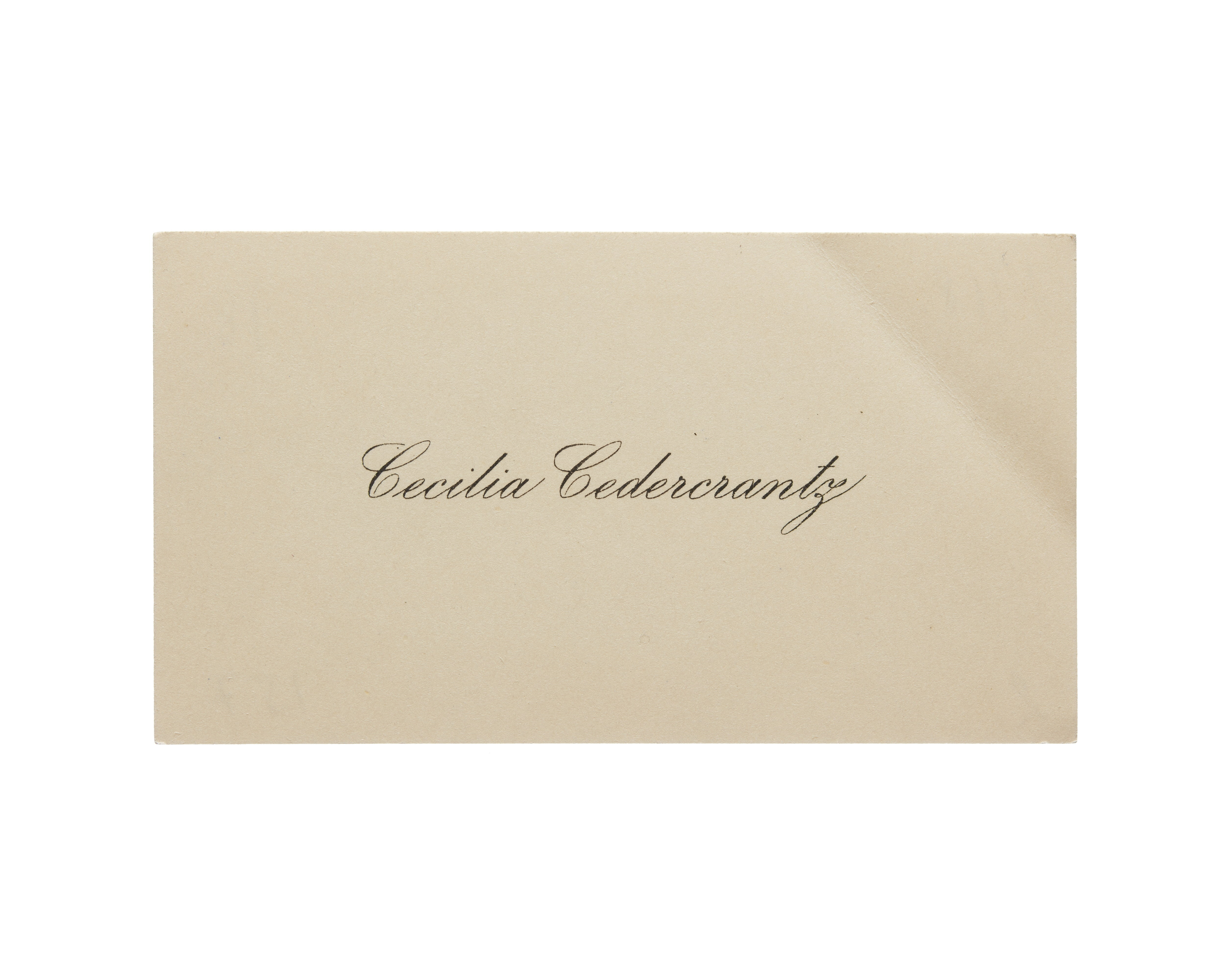 Tre visitkort från Cecilia Cedercrantz. Första kortet daterat 1916, vikt i övre högra hörnet. Andra kortet daterat 1918, vikt i övre högra hörnet. Tredje kortet daterat 1918, vikt i övre högra hörnet.