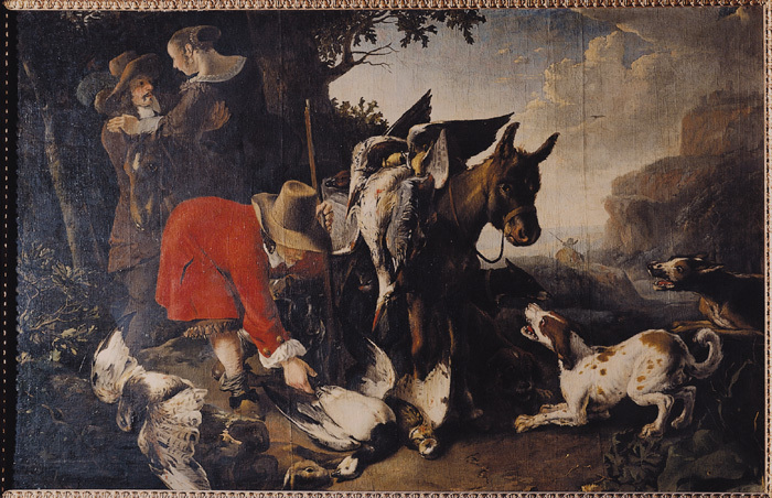 - Återkomsten från jakten. I förgrunden gråbrun jämn mark. I midten till vänster om en med skjutna fåglar lastad åsna en framåtböjd man, vänd åt höger, hållande i vänstra handen en bössa med kolfven mot marken, med den högra gripande om benen på en å marken på rygg liggande andfågel; mannen med lockigt brunt hår, i toppig gulbrun hatt med baktill något uppviket brätte, half-lång röd rock med snedskurna fickor och stora gulbruna knappar å ärmarna, hvit krage och vid handlederna pösiga hvita skjortärmar, vida bruna knäbyxor med kantfrans af bandöglor i samma färg, nedhasade grågröna strumpor samt gulbruna skor med svarta bandrosetter. Till vänster framför honom på två å marken liggande trädstammar en på rygg liggande dufhök med utbredda vingar, å marken till höger därom främre delen af en hare synlig samt till höger om gåsen en uggla. Mellan mannen och åsnan hufvudena af två hundar synliga, den främre svart, den bortre brun. Åsnan vänd halft åt höger, med brun grimma samt lastad med flere skjutna fåglar med hufvudena nedhängande å hitre sidan; underst en stor rördrom, ofvanpå denna två gulsparfvar och mellan dem en otydlig liten mörk fågel, till vänster därom en trast, en mindre rördrom och hufvudet af en brun and, längst till höger en rapphöna och en and samt till vänster om rördrommen hufvudet af en fågel med röd näbb; de flesta af de skjutna djuren med blodfläckar och skottsår. Bakom mannen å en halft åt vänster vänd brun häst med stjärna en halft bortvänd dam, hållen under armarna af en framför henne stående man samt med händerna på dennes axlar; damen med slätt uppkammadt brunt hår med nackknut, omsluten af ett hvitt pärlband, samt stora pärlörhängen, i djupt urringad mörkbrun klädning med axelrosetter, kring urringningen hvit spets samt uppvikna breda hvita manschetter. Mannen med lockigt mörkbrunt hår, mörkbruna mustascher och pipskägg, i gulbrun storbrättad hatt med en grön och en hvit plym, halflång brun rock, nedviken hvit krage samt höga bruna kragstöflar. På ömse sidor om figurerna en mörk trädstam med löfrika grenar samt längst till vänster i förgrunden mörkgrönt löfverk. Framför åsnan, mera i förgrunden, en mot denna vänd, något nedhukad hvit- och brunfläckig hund med öppet gap; bakom denna längst till höger en svart- och hvit-fläckig gråbrun fågelhund med endast främre delen synlig. Vid åsnans bortre sida två åt höger vända hundar, af hvilka hufvudena synliga, den främre brun, med hufvudet nedhukadt mot marken, den bortre svart, med hvit nos och brunt halsband. I förgrunden längst till höger gröna bladväxter. I mellanplanet bakom en brungrå klippa öfre delen synlig af en bortvänd man i storbrättad hatt samt bärande en bössa på högra axeln. Längst till höger en grågrön och ljusbrun hög klippa i tre afsatser, delvis bevuxna med gröna buskar; å krönet en borgruin med ett fyrsidigt torn. Himlen gråblå, till höger täckt af ljusare och mörkare, ljuskantade gråhvita moln. I luften en mörk fågel. Ljuset från vänster. Till vänster å öfre stockens högra ända signerad: På duk, spänd på spännram af furu, med korskryss och snedsträfvor i hörnen. Höjd: 1.7 m.; bredd: 2.63 m. Abraham Danielsz. Hondius (de Hout), f. enligt olika uppgifter omkring 1625 (eller 1638) i Rotterdam, d. omkring 1692, antagligen i London; 1659 var han ännu bosatt i Rotterdam, for vid den tiden till Amsterdam och sannolikt 1666 till London; målare (hufvudsakligen djur-) och kopparstickare. Enligt Alfred von Wurzbach: »Niederländisches Künstler-Lexikon», Erster Band, Wien und Leipzig Se Olof Granberg: »Catalogue raisonné de tableaux anciens inconnus jusqu’ici dans les collections privées de la Suède», Tome I, Samson & Wallin, Stockholm 1886, no 477; samme författare: »Inventaire général des trésors d’art, peintures & sculptures, principalement de maîtres étrangers (non Scandinaves) en Suède», Tome II, Stockholm 1912, no 137 (sid. 34). Ram (gammal): Af trä, snidad och förgylld i matt och blankt. Profil som figuren (orig. 4/i): Fig. 1. Glas. Höjd: 1.925 m.; bredd: 2.87 m. Gåfva till Walther von Hallwyl Julaftonen 1896 från hans svärmor, Johanna Kempe, f. Wallis 13 September 1818, d. 15 April 1909. Inköpt af den sistnämnda 4 November 1896 hos konsthandlaren H. BUKOWSKI, Arsenalsgatan 2 D, Stockholm, se räkning samma dag. Betald 6 November 1896. Pris: Kr. 2000, se Rescontra (Johanna Kempe) och räkning. Kända tidigare ägare: 1. Bolanders samling, försåld 1809 (se n:r 477 i Olof Granbergs förstnämnda arbete). 2. Hasselqvists samling (se samma arbete). 3. Friherre AdAm Palbitzki, Julita, Julita socken, Södermanland, (se ofvan) f. 13 Juni 1745, d. 23 Augusti 1826, gift med Magdalena Moréen, f............*745» d. 22 Mars 1821. 4. Friherre Mathias Palbitzki, Julita, Julita socken, Södermanland, f. 31 Juli 1782, d. 26 April 1851, son till föregående, gift 22 December 1807 med friherrinnan Beata Eleonora Fredrica von Ungern-Sternberg, f. 1 April 1788, d. 10 Mars 1872. 5. Grefve Ludvig Fabian Mathias Emil Lewenhaupt, Kjulsta, Stigtomta socken, Södermanland, f. 8 September 1844, d. 14 Maj 1918, systersonson till Mathias Pal-bitzki, gift 12 November 1885 med Ida Felicia Georgina Louise Gosling, f. 29 Augusti 1859 i London. Af grefve Emil Lewenhaupt försåld å auktion hos konsthandlaren H. Bukowski 16 Oktober 1895 (katalog 96 n:r 760), därvid återropad (enligt anteckning i katalogen), därefter ånyo försåld å auktion hos konsthandlaren H. Bukowski 10 Mars 1896 (katalog 99 n:r 145), därvid ånyo återropad (enligt anteckning i katalogen). Af grefve Emil Lewenhaupt senare försåld genom konsthandlaren H. Bukowski.