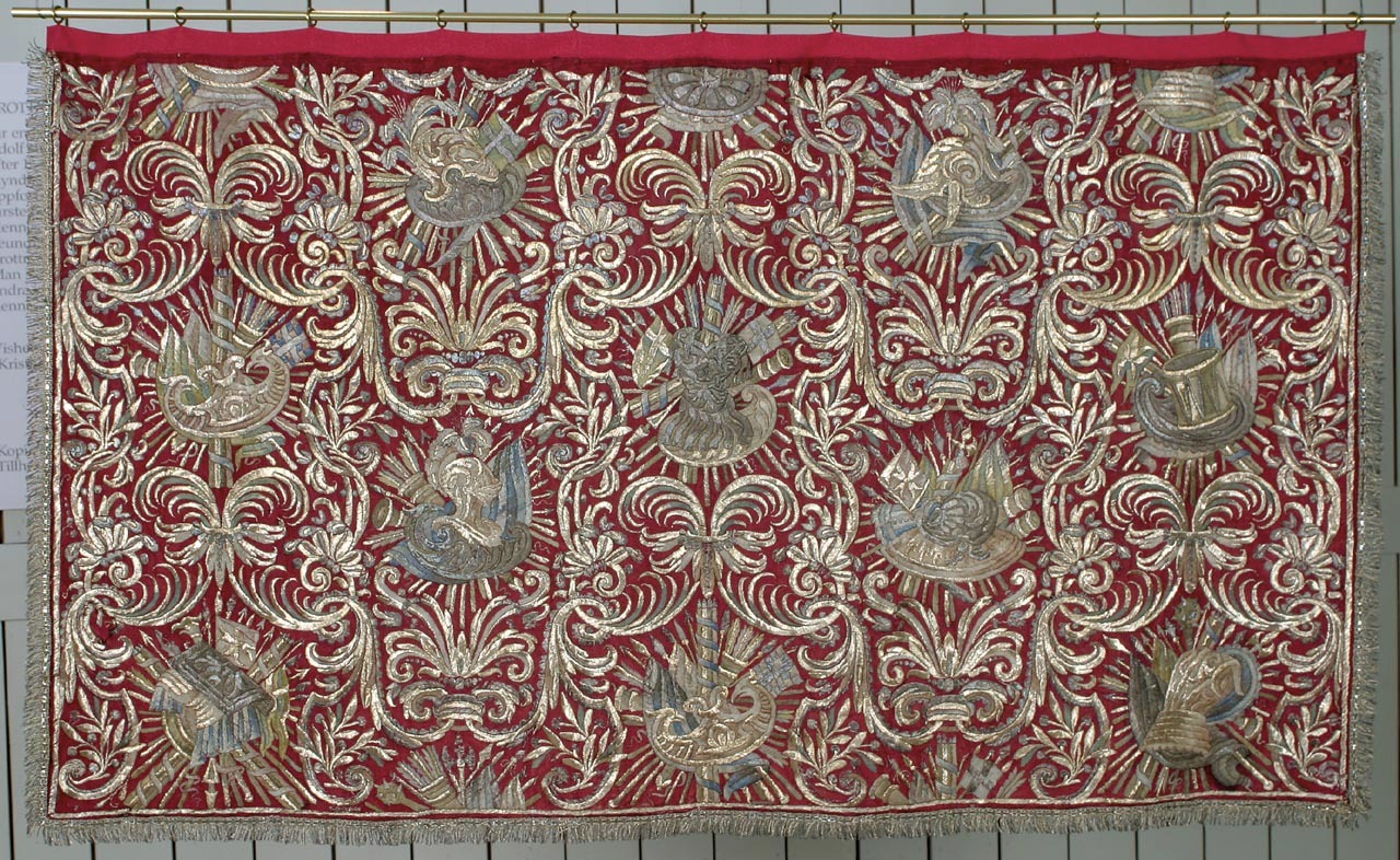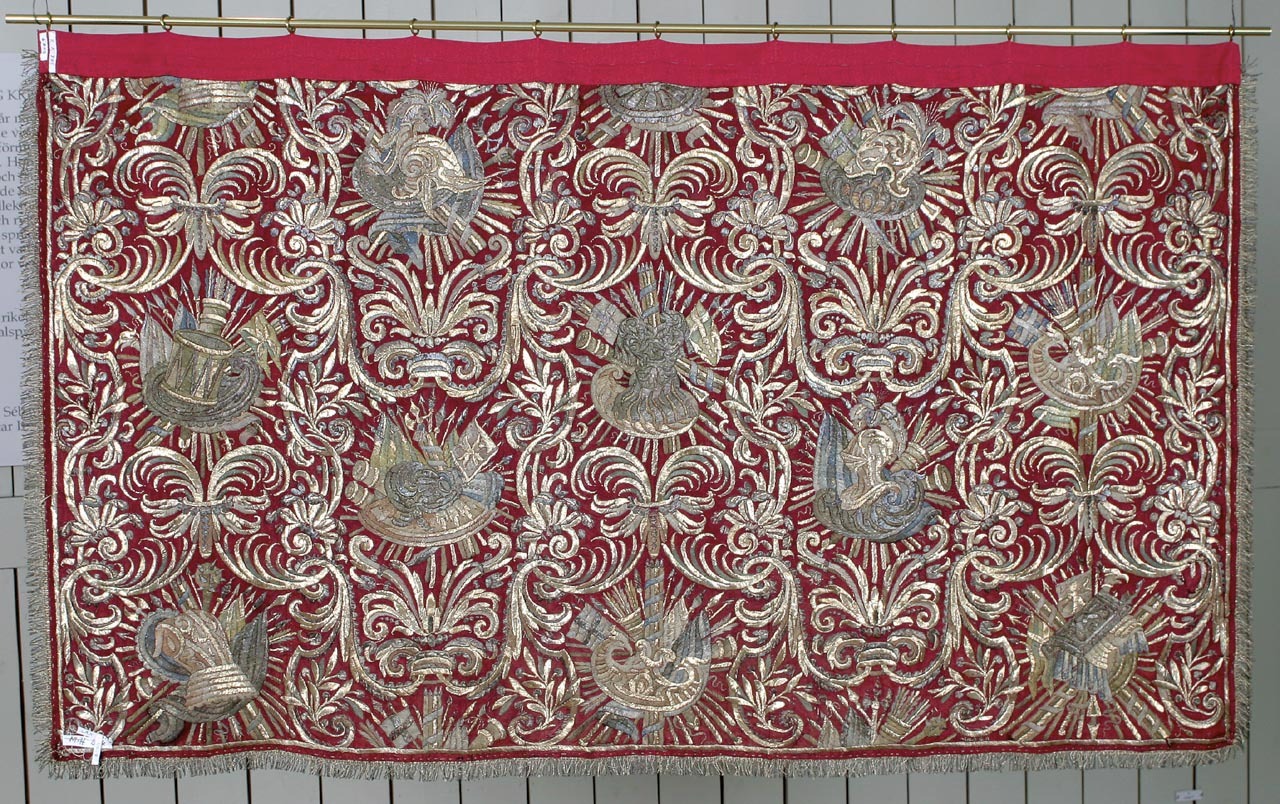- 6 st Gardiner af Carmoisie rödt sammet, tursnell och broderade på båda sidor lika med silfver, guld och åtskillige slags färger, soile, broderingen består af åtskillige krigsgevär samt på 3 sidor med smala silfver och guldfransar.