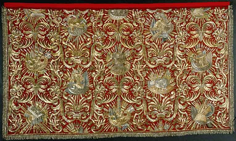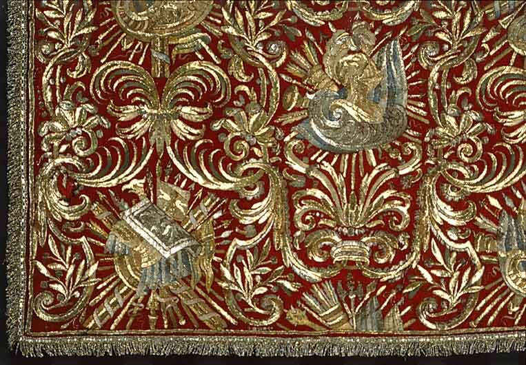 - 6 st Gardiner af rödt silke, broderade på båda sidor med silfver-, guld-, och silke; på tre sidor smala guld- ochsilfverfransar; 1 söndrig och utan fransar