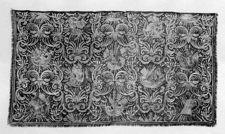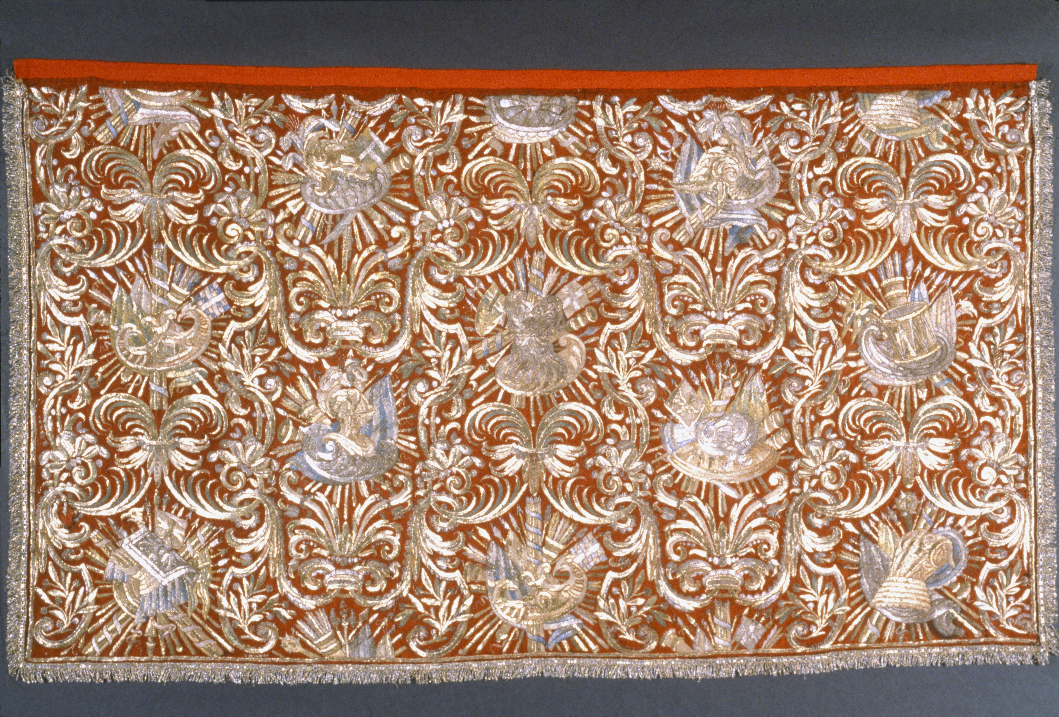 - do. do. (Gardiner af rödt silke, på båda sidor broderade i guld, silfver och silke samt på trenne sidor kantade med guld- och silfverfransar.)