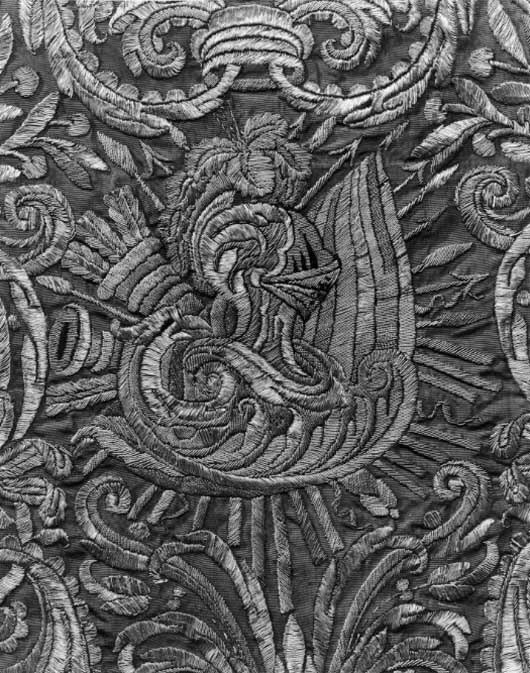 545 - Ett stort Täcke eller ÖfverTåg utanpå Vagns-Korgen af rödt Sammet öfver allt rikt broderadt med Silfver och Guld samt allehana slags färgor Silke, upphöjt Arbetei Trophéer; Däromkring i öfversta Kanten är en liten Guld Galon; men i den yttersta kanten en stor GuldFrans rundtomkring, underfodrat med rödt Sarge.