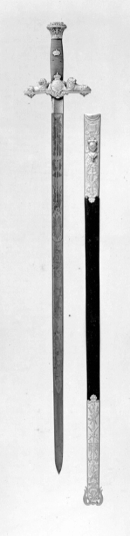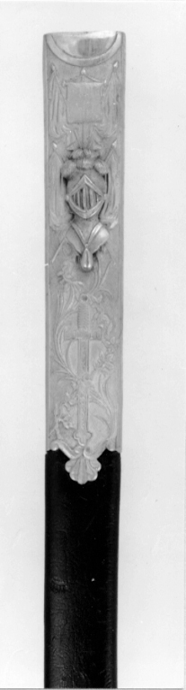 Balja av svärtat läder beslagen med munbleck, h: 185 mm och doppsko, h: 225 mm, båda med snidad, graverad och punsad ornering. Munblecket med en slät halvoval, därefter korslagda fanor och standar, löst tvinnad ek- och palmkvist. Nederkanten konturerad i form av en nedåtriktad, fembladig palmett. Koppelhake, l: 50 mm i form av en plymförsedd visirhjälm. Dekoren på insidan lika som den på utsidan. Doppsko med konturerad överkant i form av en uppåtriktad, fembladig palmett, därefter två korslagda gevär och ett stångvapen och två horn samt därefter ett enkelt bladornament. Insidans dekor lika. Släpsko i form av från doppskons nederkants mitt utgående, uppåt-utåtsvängda palmbladsornament.