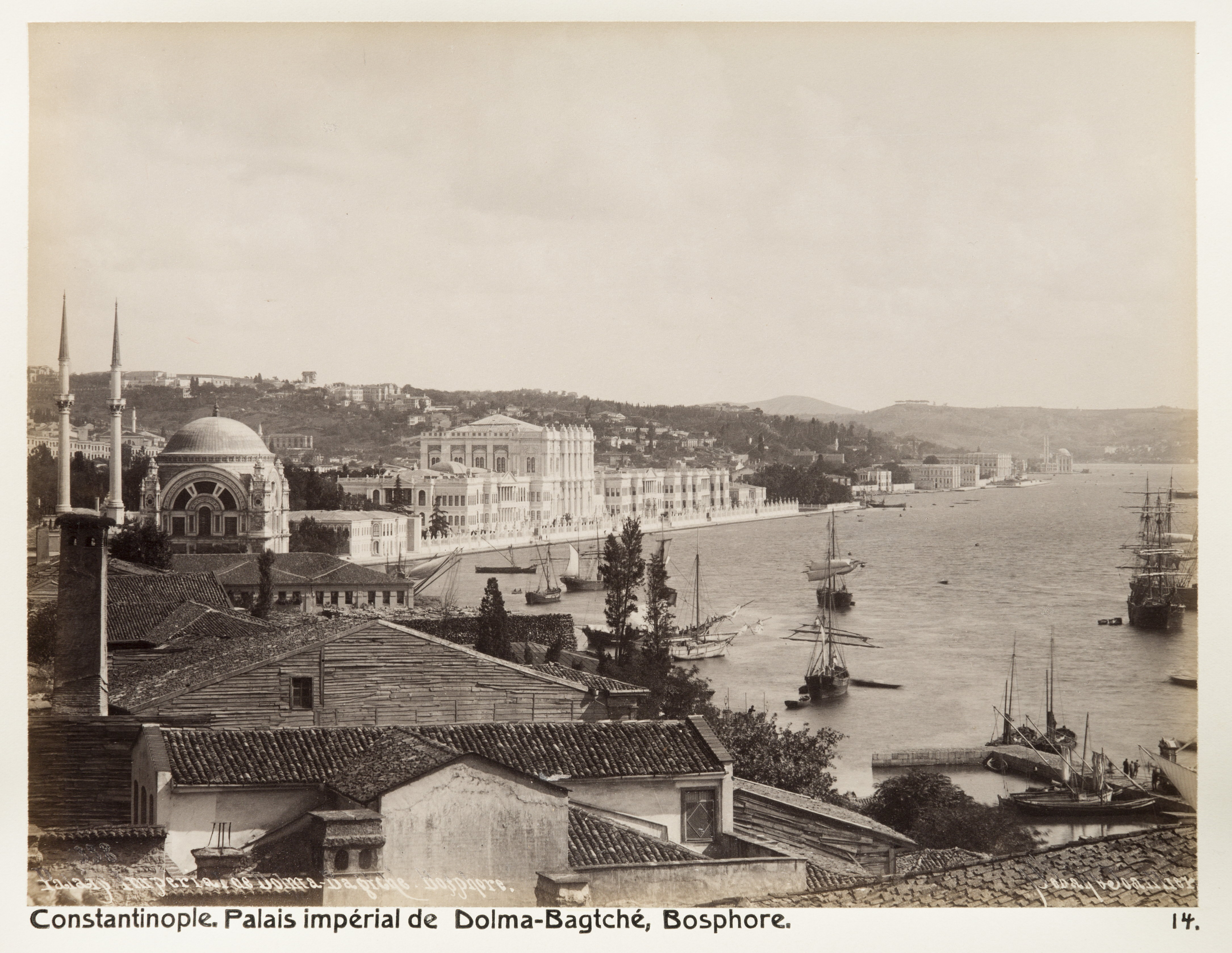 Dolmabahçepalatset vid Bosporen, Konstantinopel. Text på originalet: "Constantinople. Palais impérial de Dolma-Bagtché, Bosphore." Fotografierna LXVI:O.01.-54. kommer från resan till Turkiet och Mindre Asien som Wilhelmina och Walther von Hallwyl gjorde den 27 april - 20 juni 1901. De lämnade Sverige den 5 november 1900 för Egypten, där de stannade till den 28 mars 1901, då de fortsatte till Palestina. Den 27 april fortsatte de till Turkiet och Mindre Asien. Med på resan var Wilhelminas sällskapsdam, fröken Ida Uhse. I Konstantinopel (Istanbul) anslöt sig Wilhelminas mor Johanna Kempe och kusindottern Elma Hök. Fotografierna är inköpta av Wilhelmina i Konstantinopel (Istanbul) och Brussa. Alla uppgifter kommer från Ida Uhses reseanteckningar.